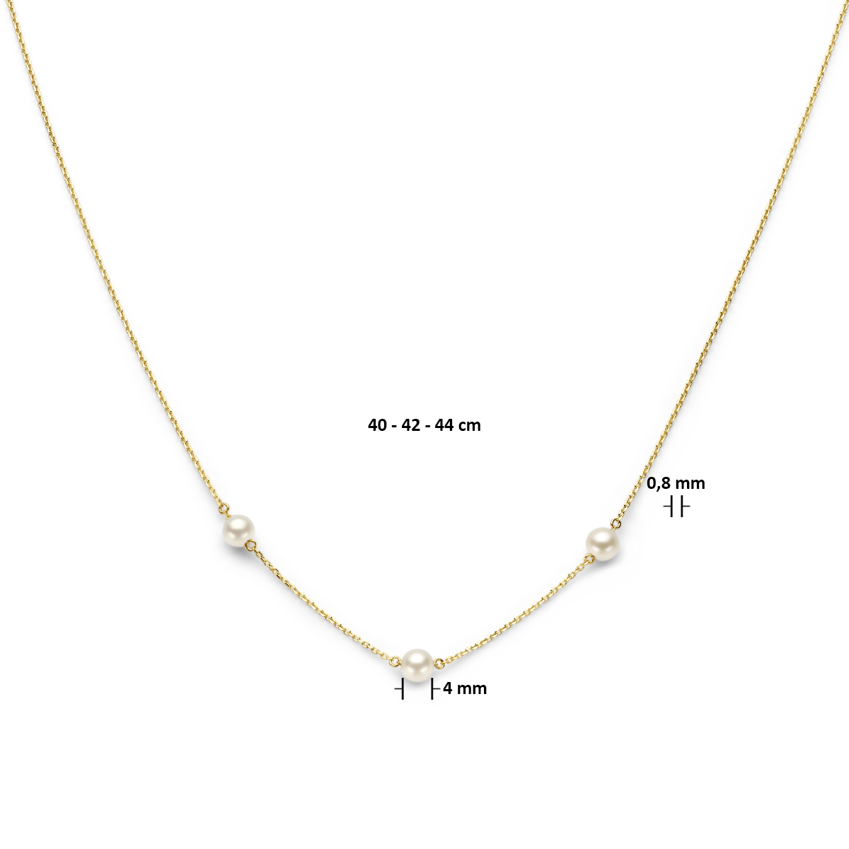 14k Geelgouden collier uitgevoerd met zoetwaterparels. Het collier heeft draaglengtes van 40, 42 en 44cm. De schakelbreedte is 0.8mm.