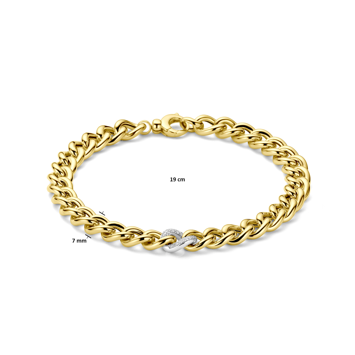 14kBicolor geel- en witgouden armband uitgevoerd met schitterende diamant. De armband heeft een schakelbreedte van 7mm en een draaglengte van 19cm. Het totale diamantgewicht is 0.10ct.