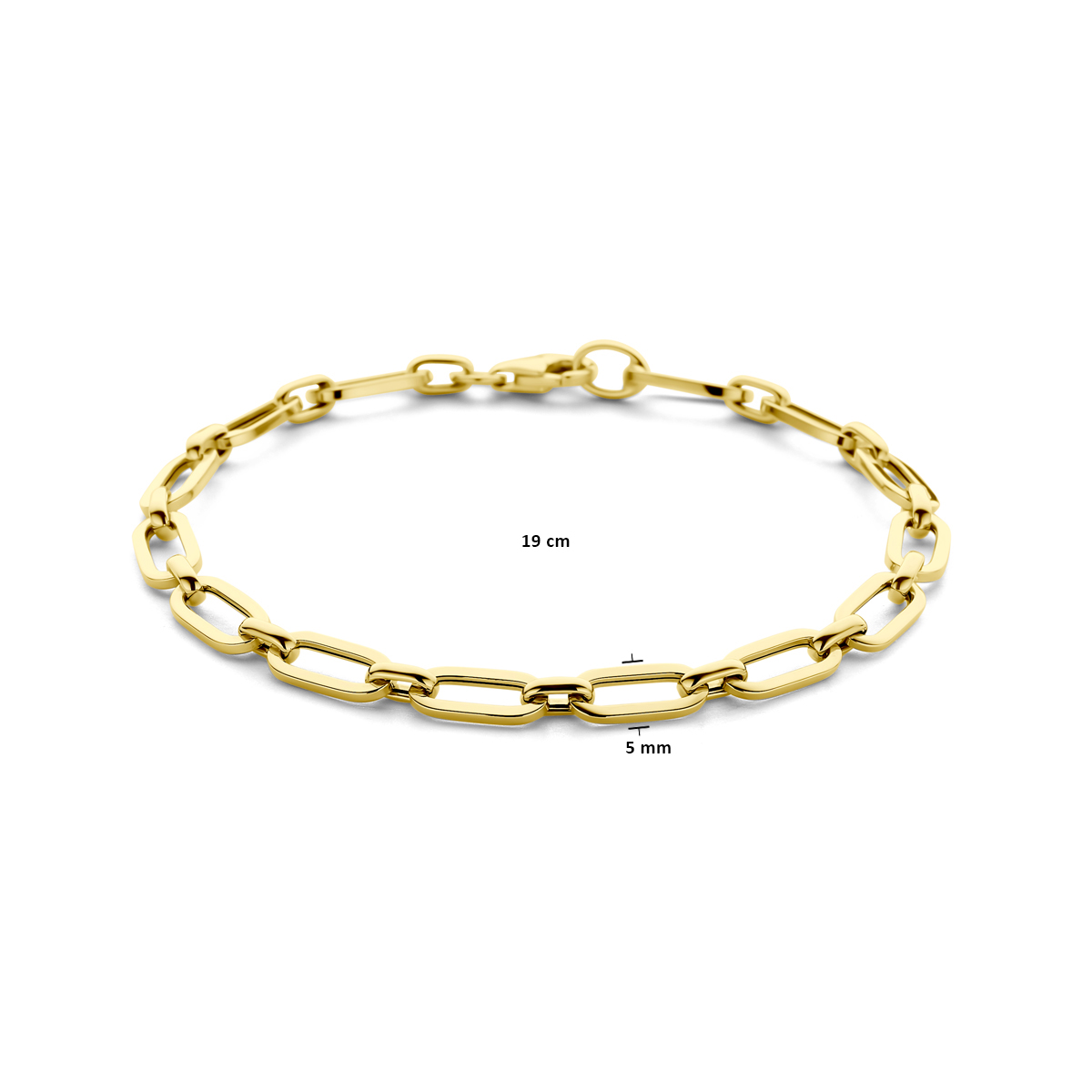 14k Geelgouden armband met een schakelbreedte van 5mm en een draaglengte van 19cm. Uitgevoerd met karabijnsluiting.