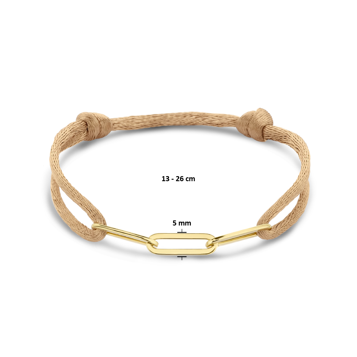 Caramel gevlochten armband uitgevoerd met een verguld op 925 zilveren element. De armband heeft draaglengtes van 13 tot 26cm. Het element heeft een afmeting van 40x5mm. Geen garantie op plating.