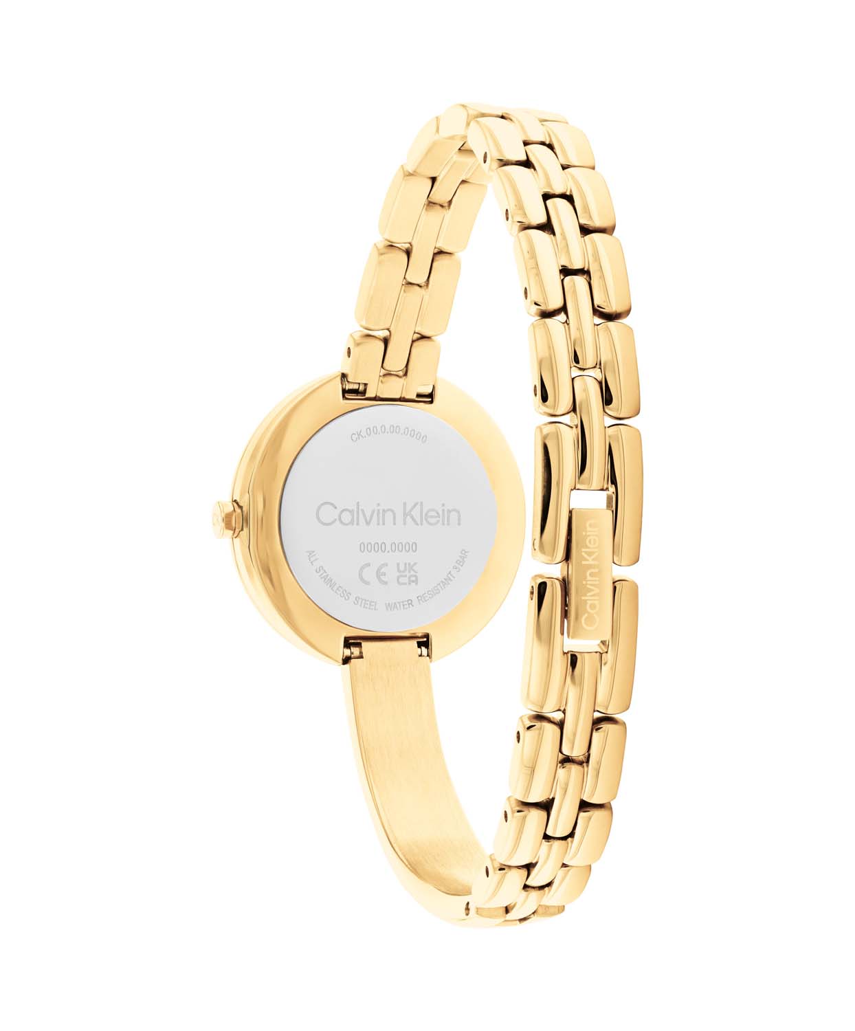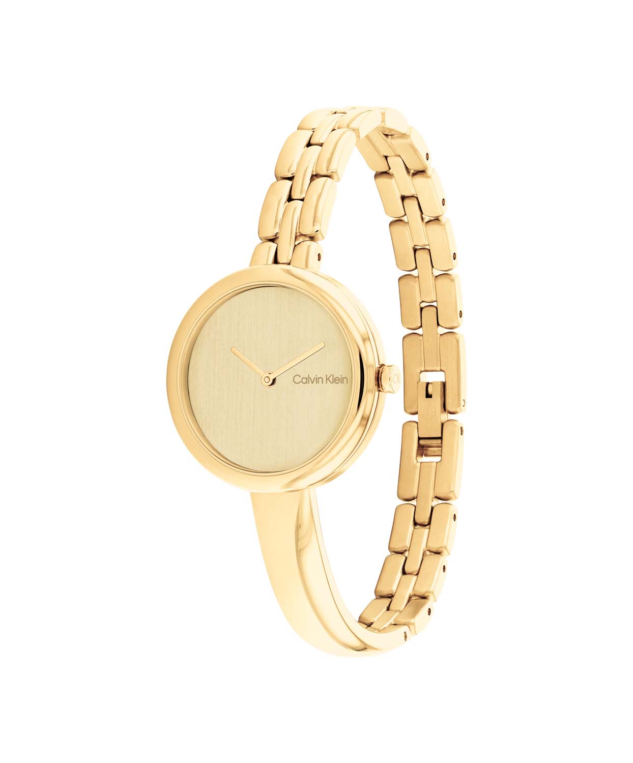 Dit Calvin Klein dameshorloge met nr CK25200279 is een chique ontwerp. De ronde goudkleurige stalen kast heeft een gladde goudkleurige bezel. Op de champagne brushed wijzerplaat is de merknaam gedrukt en de tijd wordt aangegeven met hele fijne wijzers. Aan de stalen kast zit een goudkleurige half bangle, half schakelband. Het sierlijke horloge heeft een mineraalglas, een doorsnee van 28mm en is 3 ATM.