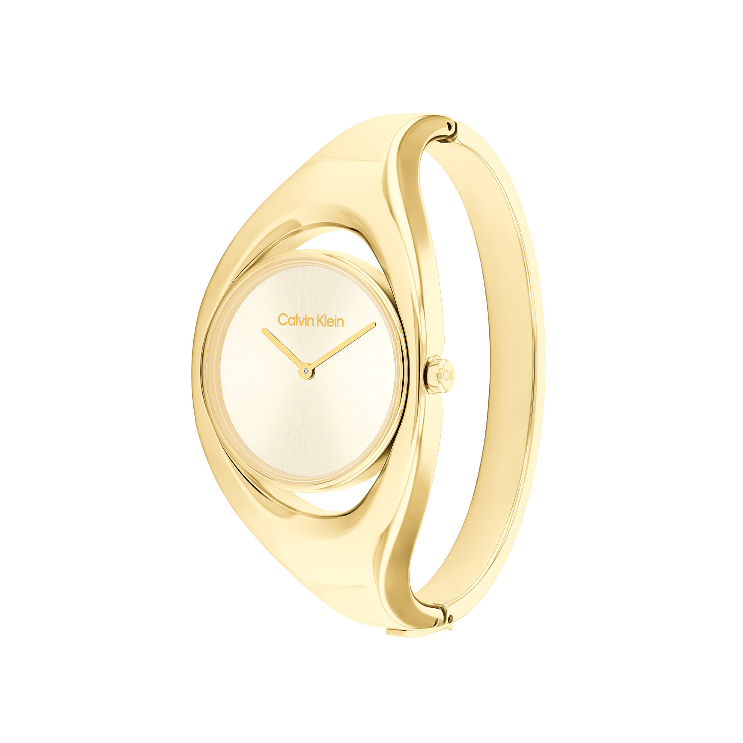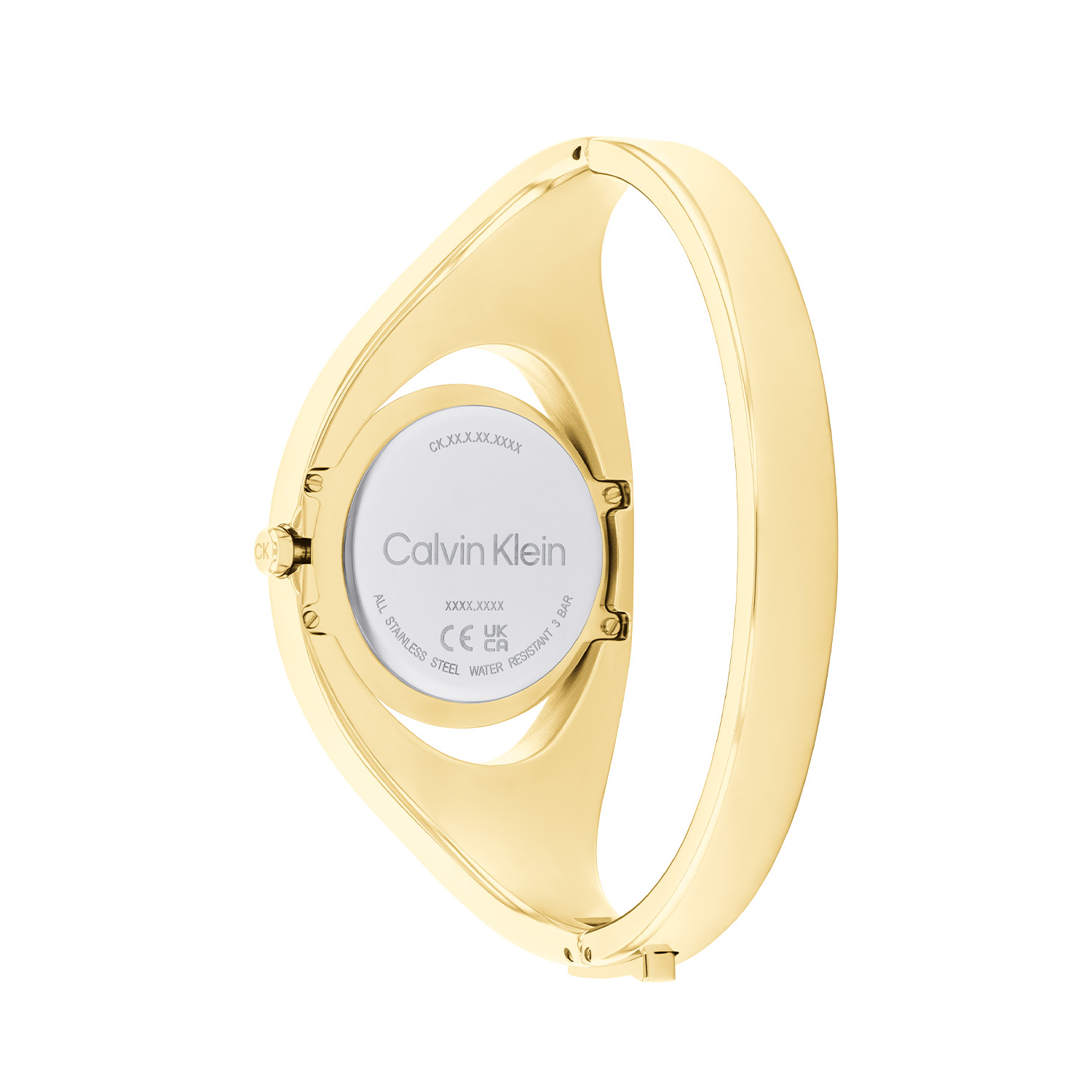 Dit Calvin Klein dameshorloge met nr CK25200422 is een chique ontwerp. De stijlvolle goudkleurige ronde stalen kast heeft een opening in de rand, dit geeft het klokje een zwevend effect in de band. Op de goudkleurige sunray wijzerplaat zijn de fijne wijzers mooi zichtbaar en staat de naam Calvin Klein afgedrukt. Het bezondere aan dit model is een doorlopende goudkleurige bangle band. Het sierlijke horloge heeft een mineraalglas, een doorsnee van 30mm en is 3 ATM.