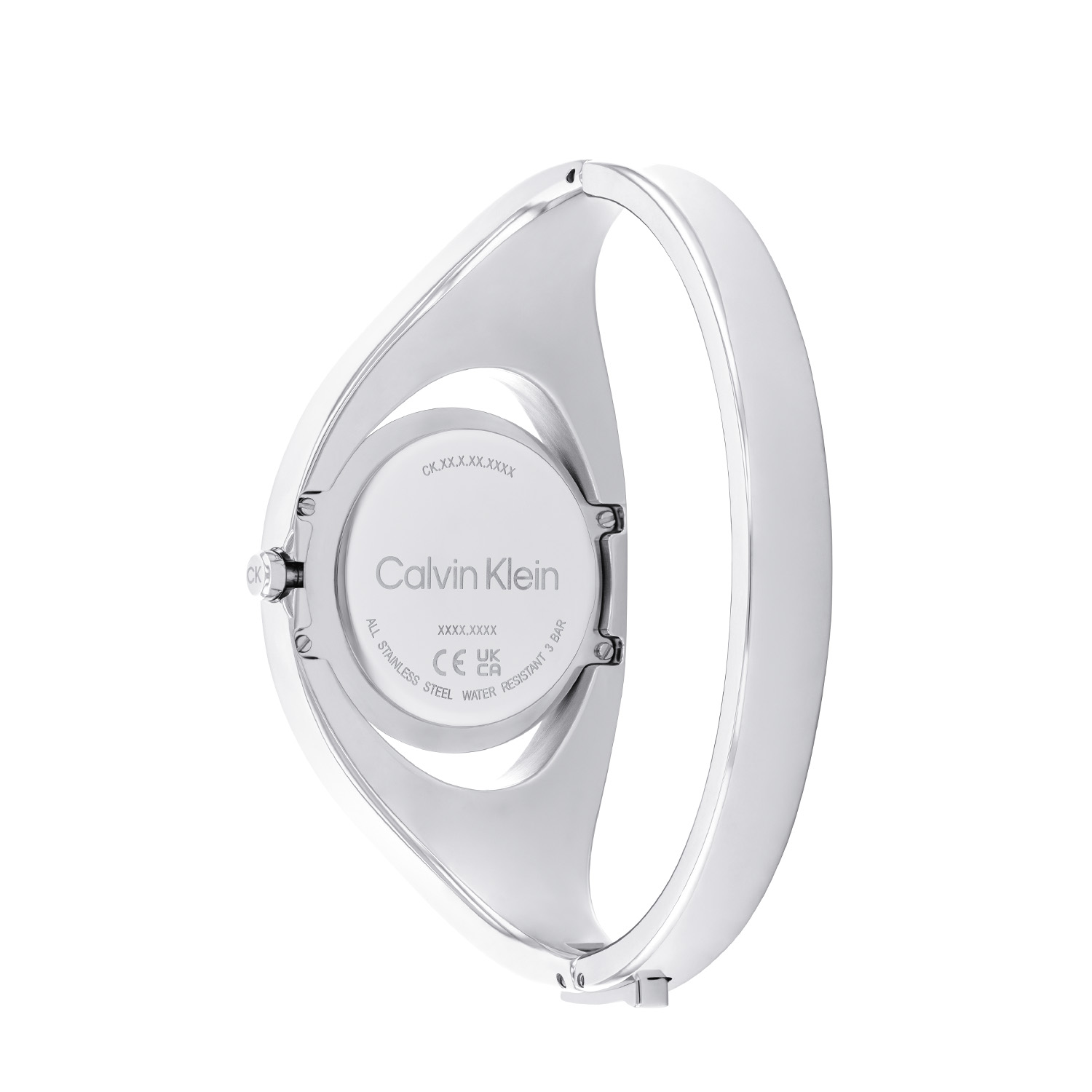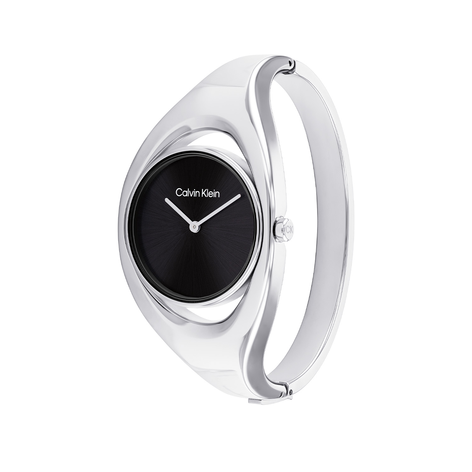 Dit Calvin Klein dameshorloge met nr CK25200423 is een chique ontwerp. De stijlvolle zilverkleurige ronde stalen kast heeft een opening in de rand, dit geeft het klokje een zwevend effect in de band. Op de zwarte sunray wijzerplaat zijn de fijne wijzers mooi zichtbaar en staat de naam Calvin Klein afgedrukt. Het bezondere aan dit model is een doorlopende zilverkleurige bangle band. Het sierlijke horloge heeft een mineraalglas, een doorsnee van 30mm en is 3 ATM.