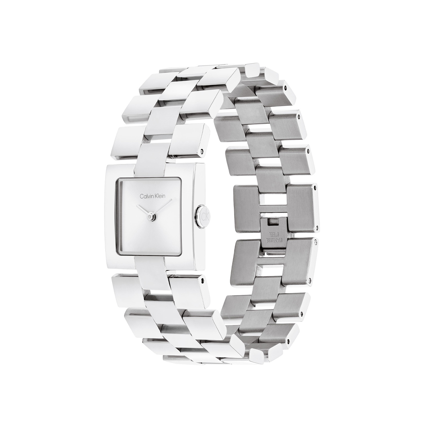 Dit Calvin Klein dameshorloge met nr CK25100088 is een opvallend ontwerp. De strakke vierkante stalen kast heeft een zilverkleurige sunray wijzerplaat met fijne zilverkleurige wijzers en het logo. Strak aan het kastje zit een brede vierkante schakelband met een druksluiting. Het elegante dameshorloge heeft een mineraalglas, een afmeting van 22mm en is 3ATM.