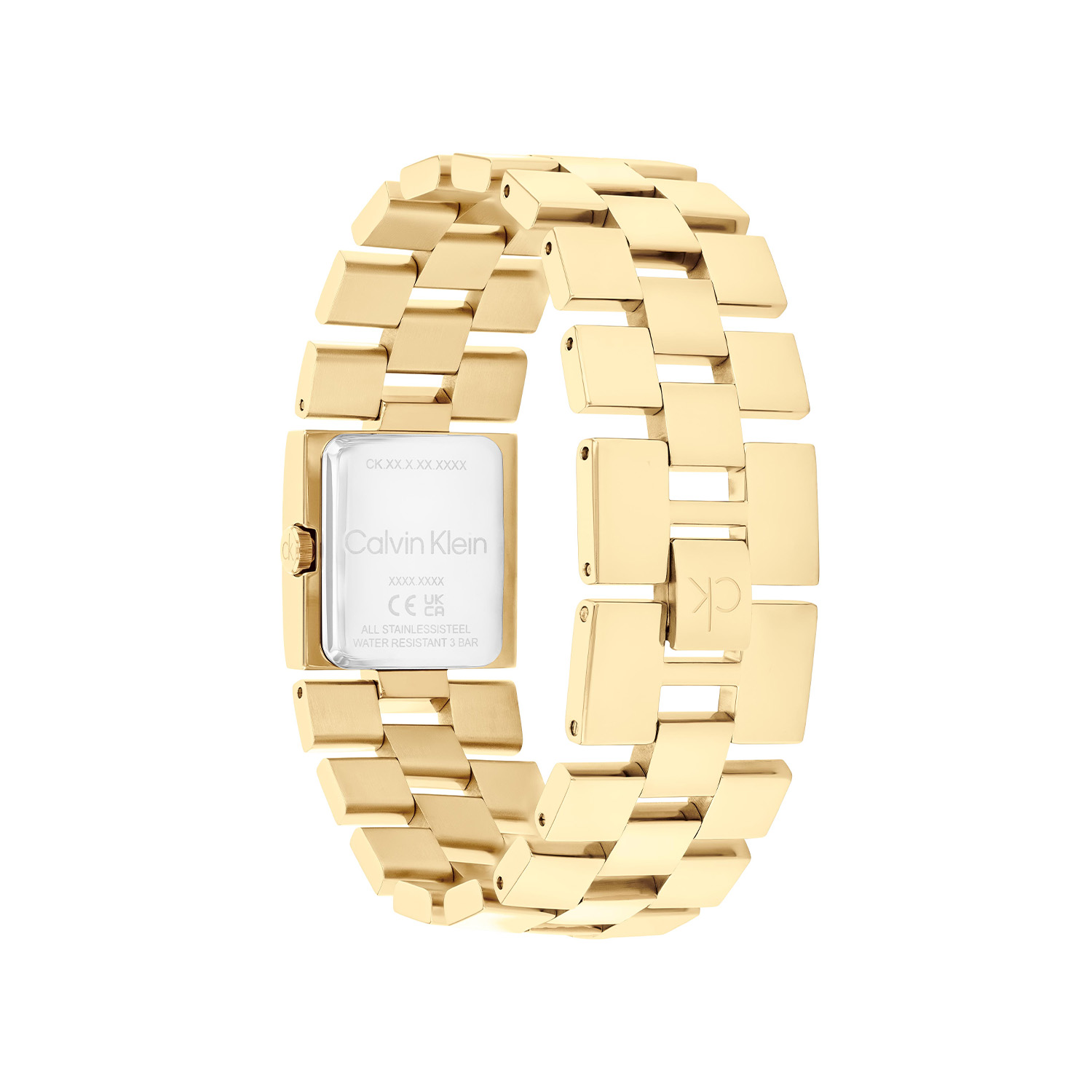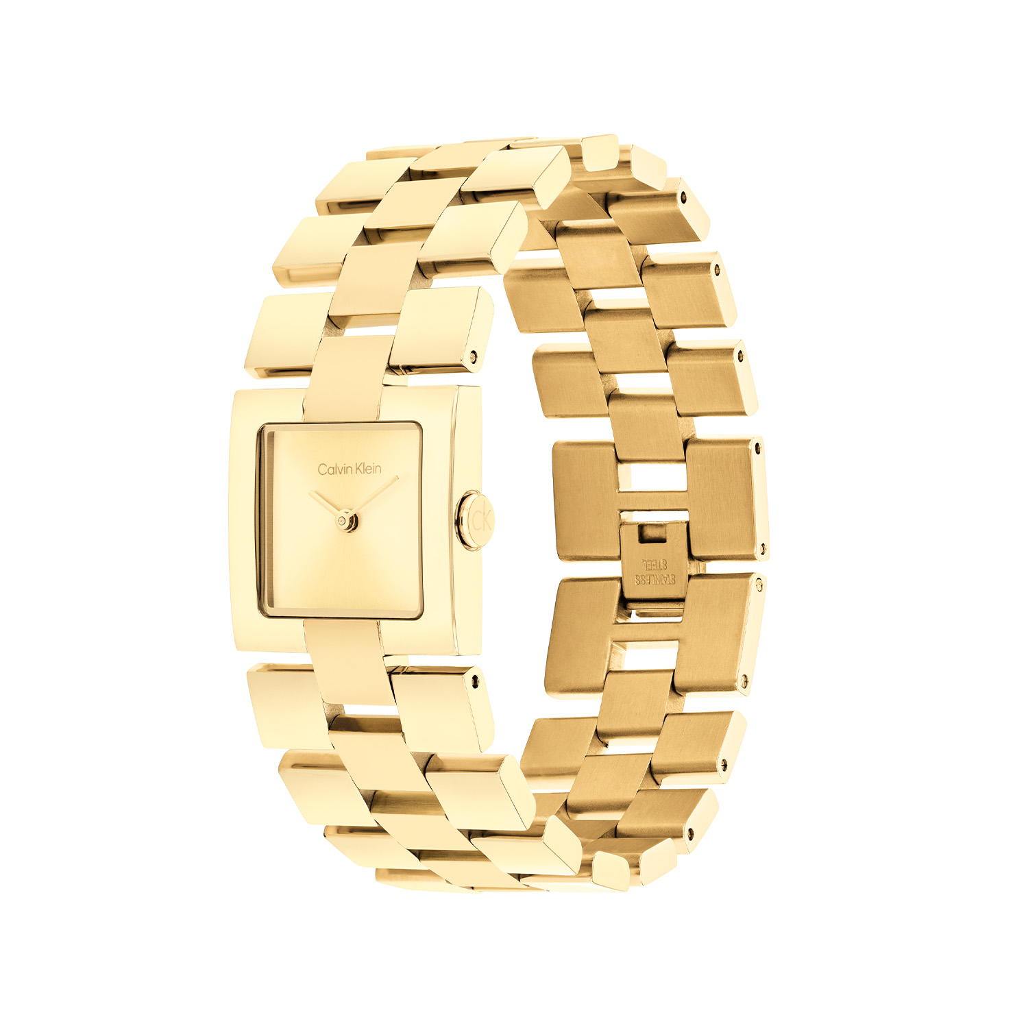 Dit Calvin Klein dameshorloge met nr CK25100089 is een opvallend ontwerp. De strakke vierkante goudkleurige stalen kast heeft een goudkleurige sunray wijzerplaat met fijne goudkleurige wijzers en het logo. Strak aan het kastje zit een brede vierkante goudkleurige schakelband met een druksluiting. Het elegante dameshorloge heeft een mineraalglas, een afmeting van 22mm en is 3ATM.