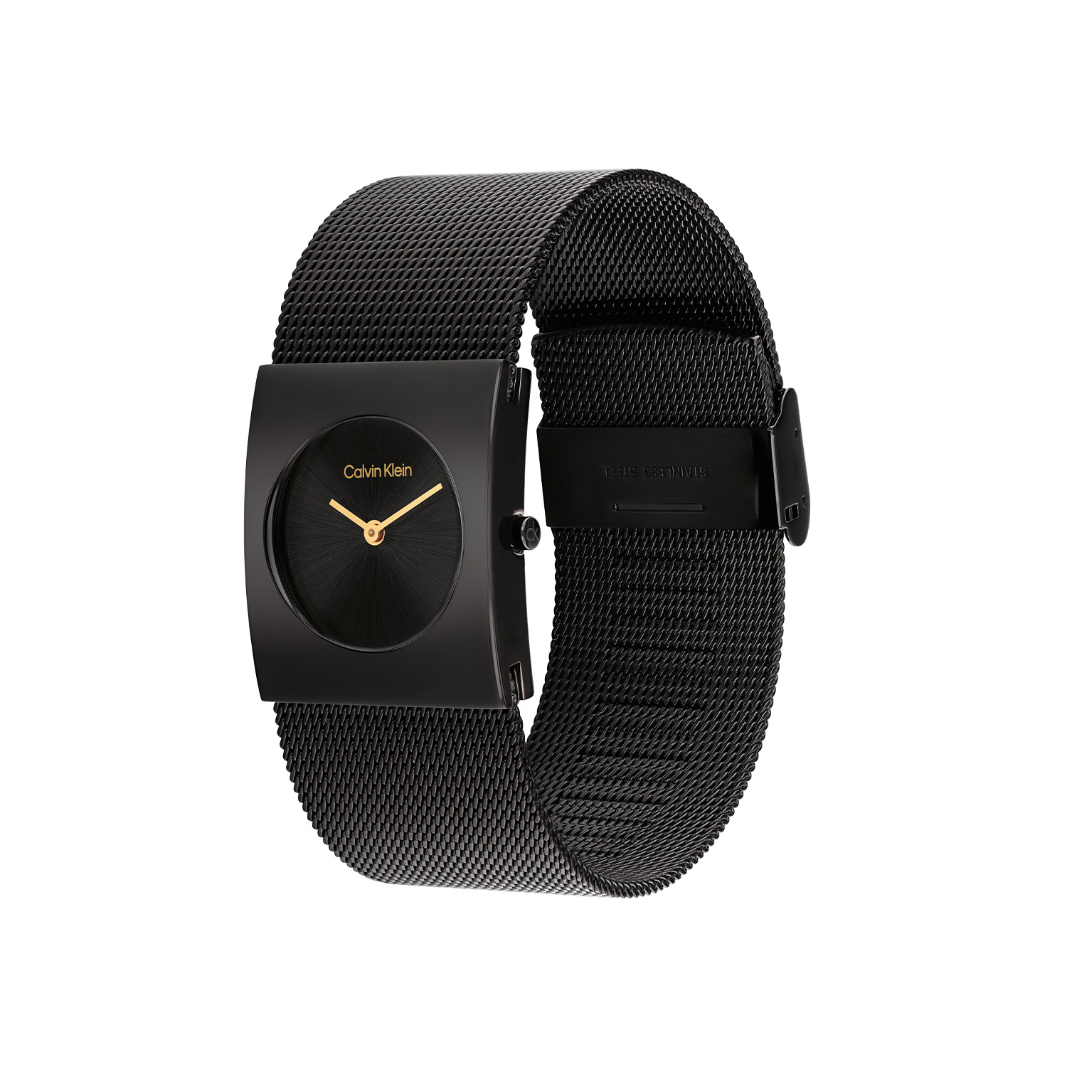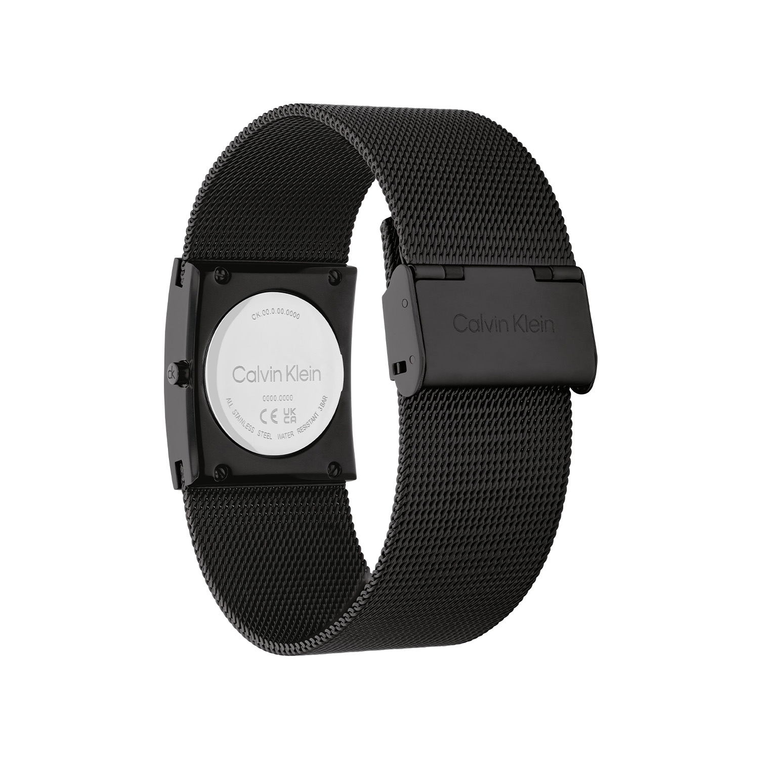 Dit Calvin Klein dameshorloge met nr CK25100109 is een opvallend ontwerp. De strakke vierkante stalen zwarte kast heeft een zwarte sunray wijzerplaat met fijne wijzers en het logo. Strak aan het kastje zit een brede zwarte milanese band met een druksluiting. Het elegante dameshorloge heeft een mineraalglas, een afmeting van 26mm en is 3ATM.
