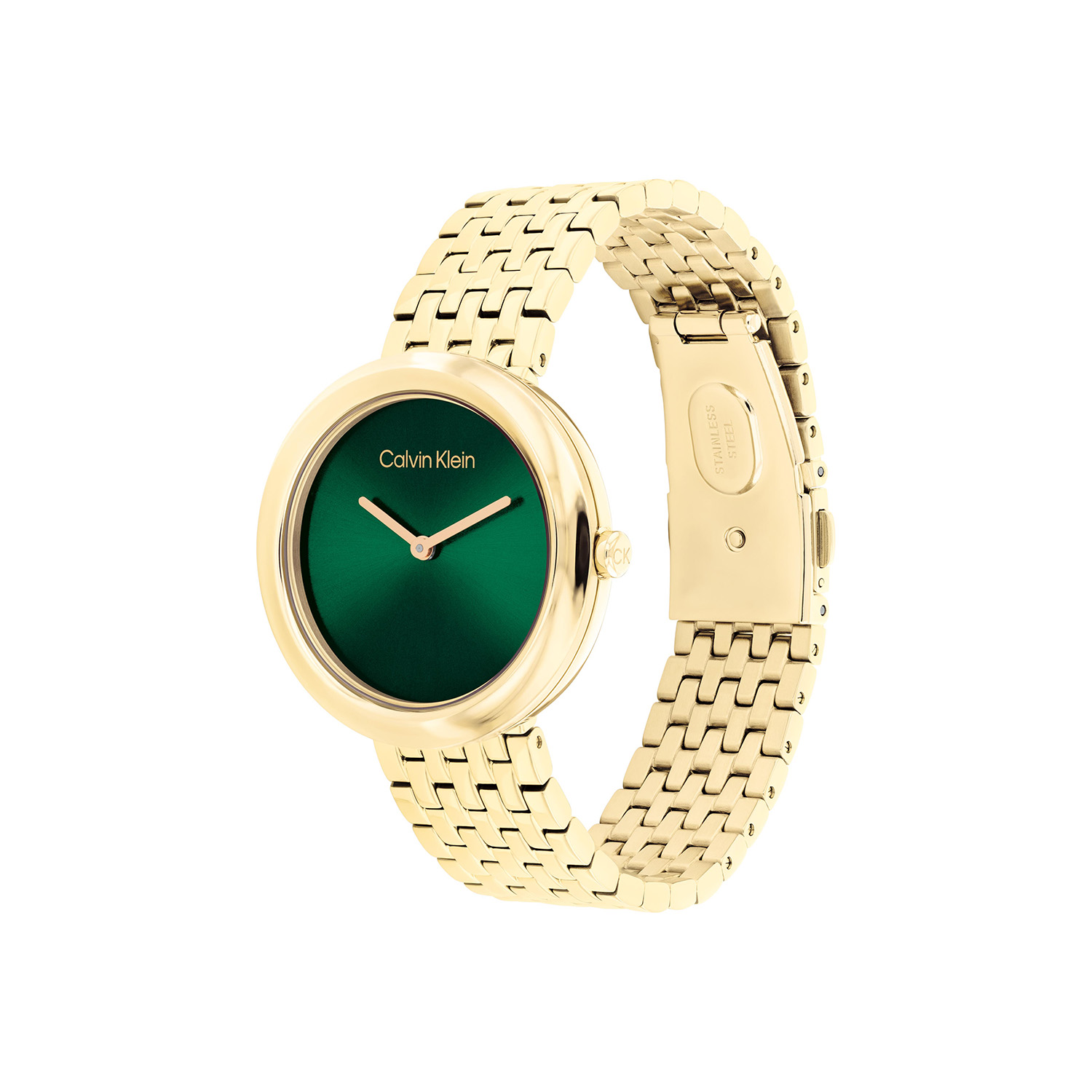 Dit Calvin Klein dameshorloge met nr CK25100066 is een chique en stijlvol ontwerp. De stijlvolle goudkleurige stalen kast heeft een bolle rand en een  groene sunray wijzerplaat met enkel wijzers en de merknaam. Strak aan de vol glimmende kast zit een goudkleurige fijne schakelband. Het opvallende horloge heeft een mineraalglas, een doorsnee van 34mm en is 3ATM.