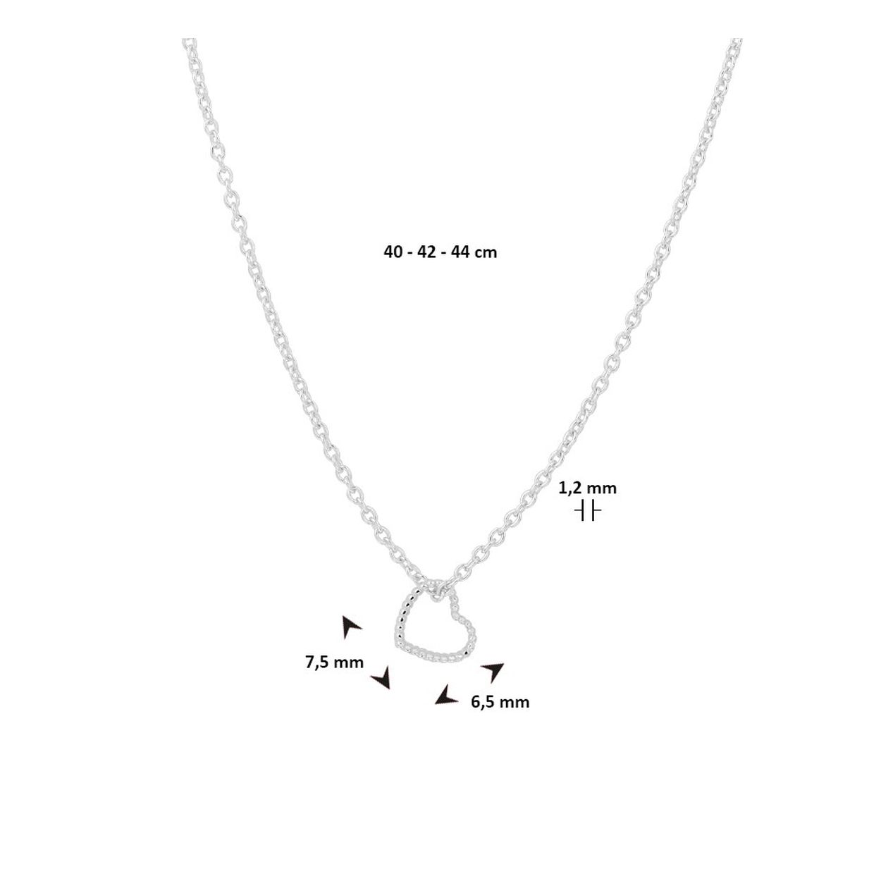Gerhodineerd 925 zilveren collier uitgevoerd met een hangertje in de vorm van een hartje. Het collier heeft draaglengtes van 40, 42 en 44cm. Het hartje heeft een afmeting van 6.5x7.5mm. De schakelbreedte is 1.2mm.