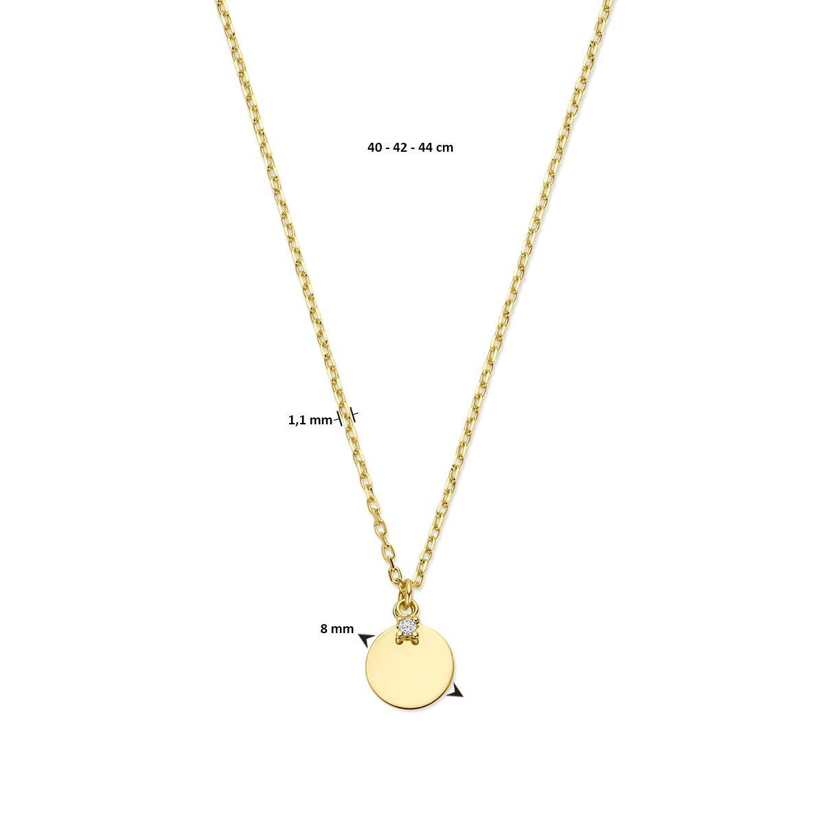 14k collier uitgevoerd met een rondje en zirkonia. Het collier heeft draaglengte van 40-42-44cm en een schakelbreedte van 1.1mm.