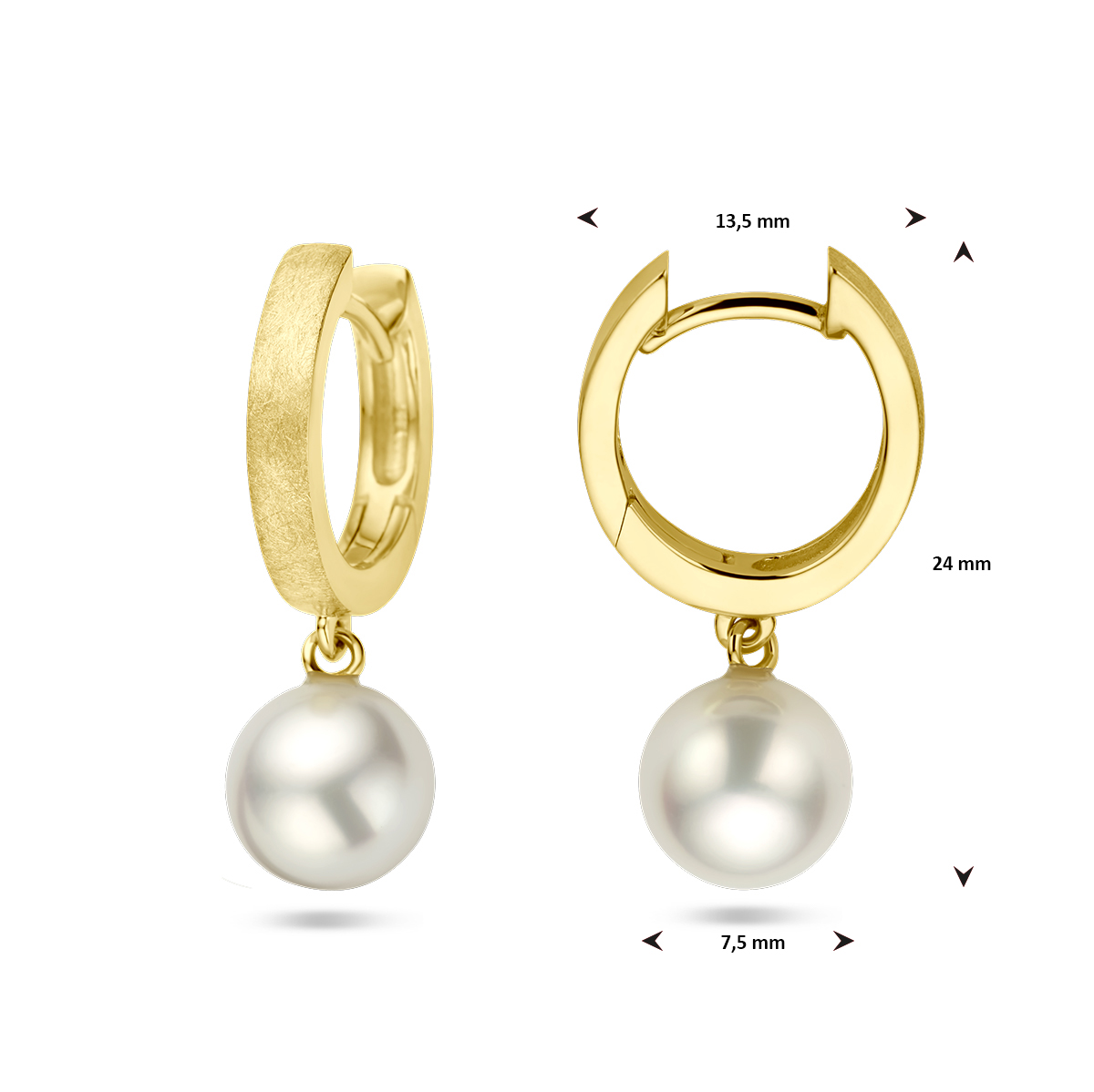 14k Geelgouden parel klapoorringen. De klapoorringen hebben een afmeting van 13.5 x 2.5mm. De parel heeft een diameter van 7.5mm.
