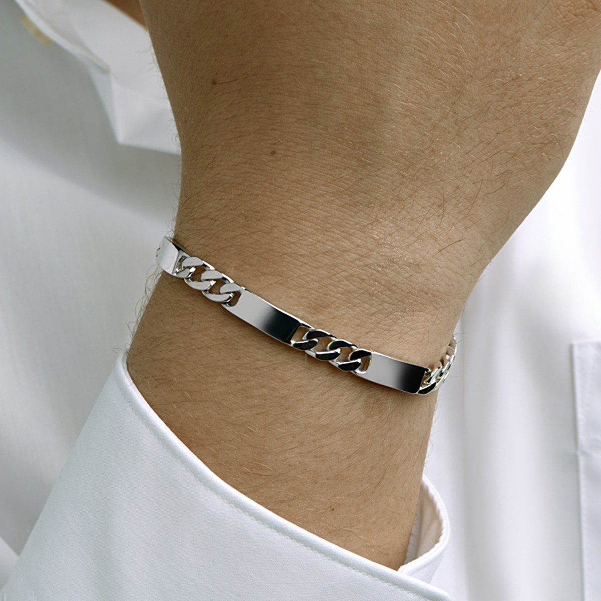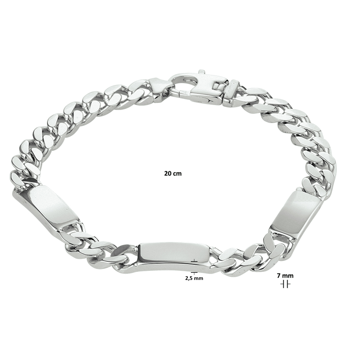 Gerhodineerd 925 zilveren graveerarmband met een breedte van 7mm en een stevige karabijn sluiting. De graveerplaat heeft een dikte van 2.5mm. De schakelbreedte is 7.0mm.