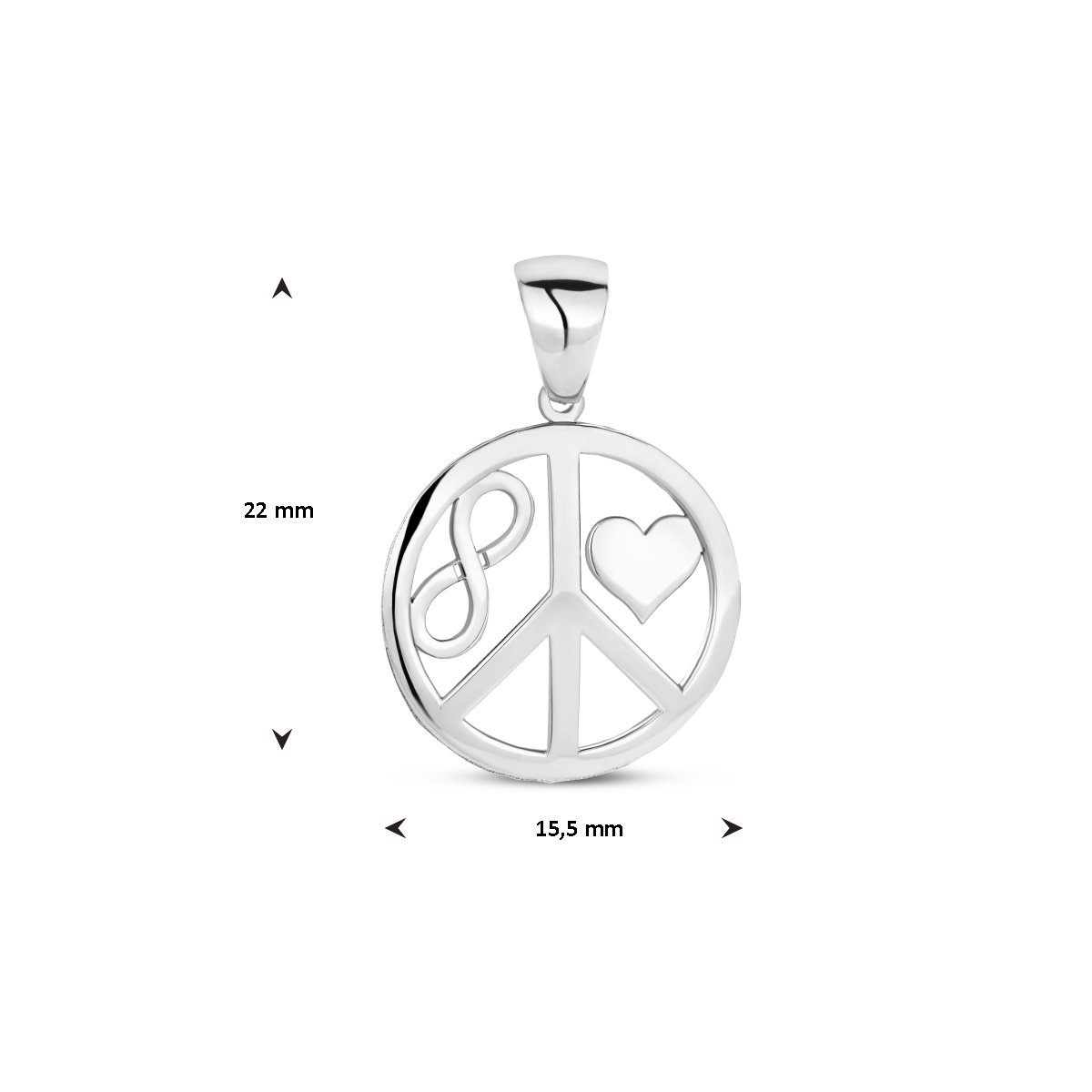 Gerhodineerd 925 zilveren hanger uitgevoerd in de vorm van een cirkel met hart, peace en infinity teken. De hanger heeft een afmeting van 22x15.5mm.