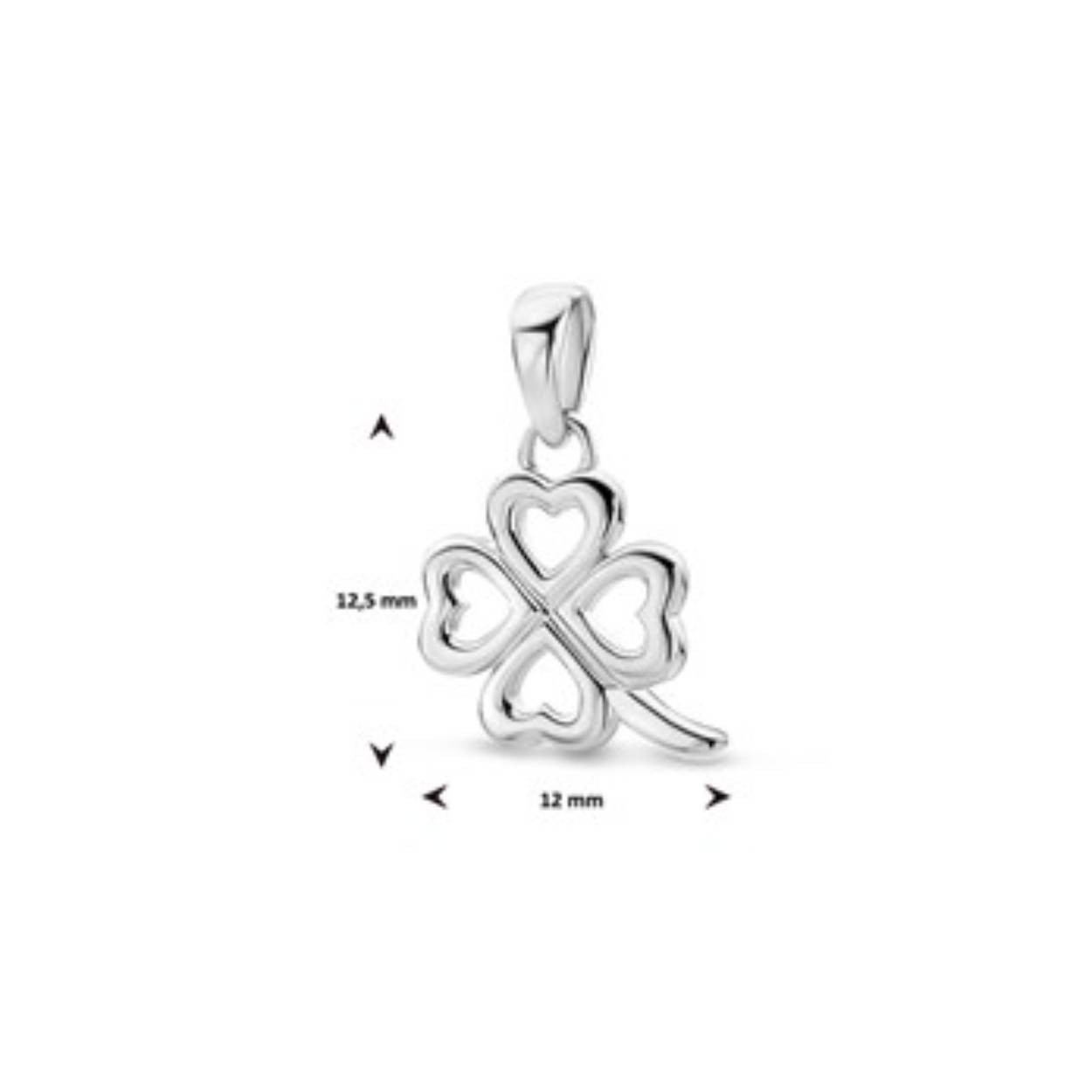 Gerhodineerd 925 zilveren hanger uitgevoerd in de vorm van een klavertje. De hanger heeft een totale hoogte van 1.7cm en een breedte van 12mm.