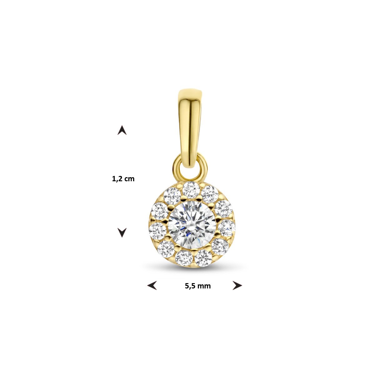 14k Geelgouden hanger uitgevoerd met schitterende zirkonia. De hanger heeft een totale hoogte van 12mm.