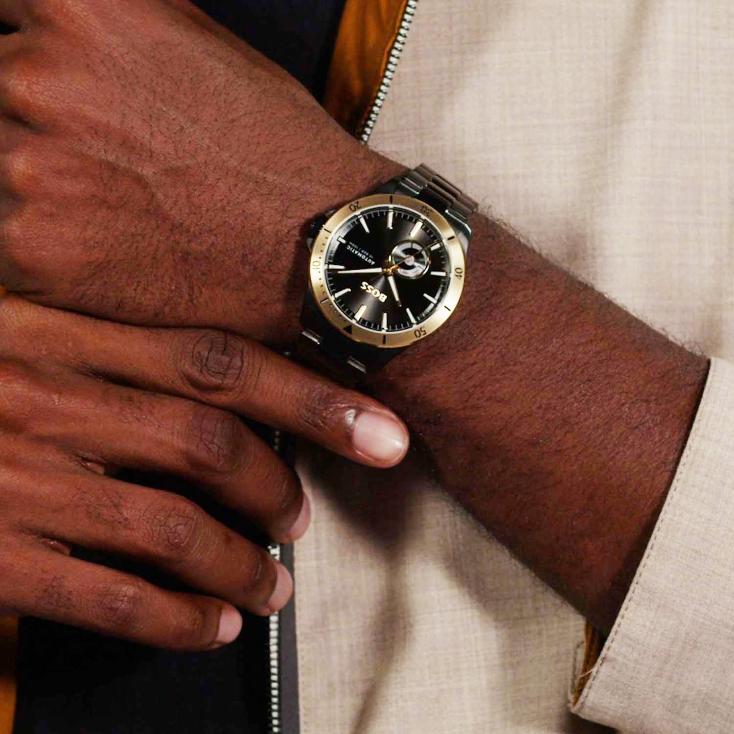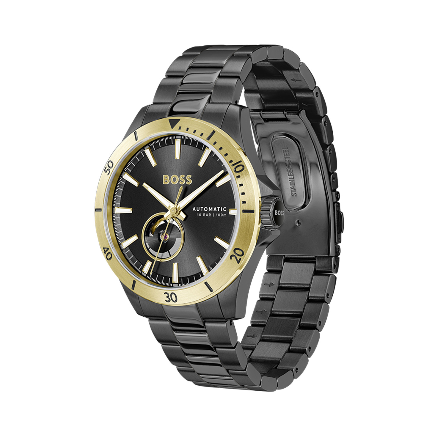 Dit horloge van het merk BOSS by Hugo Boss is voorzien van een automatisch 82S3 Miyota uurwerk. Deze laad zich op door middel van beweging van de pols om te zetten in spanning op een veer. Dit uurwerk heeft een gang reserve van ongeveer 42 uur, maar kan ook door middel van kroon slagen worden opgewonden. De wijzerplaat is voorzien van een zogenoemd open hart waar u de balans en één van de 21 robijnen kunt bewonderen. Het uurwerk is accuraat tot een bovengemiddelde 20~40 seconden per dag. Om de het horloge waterdicht te behouden tot een druk van 10atm behoort de kroon te zijn dichtgeschroefd.