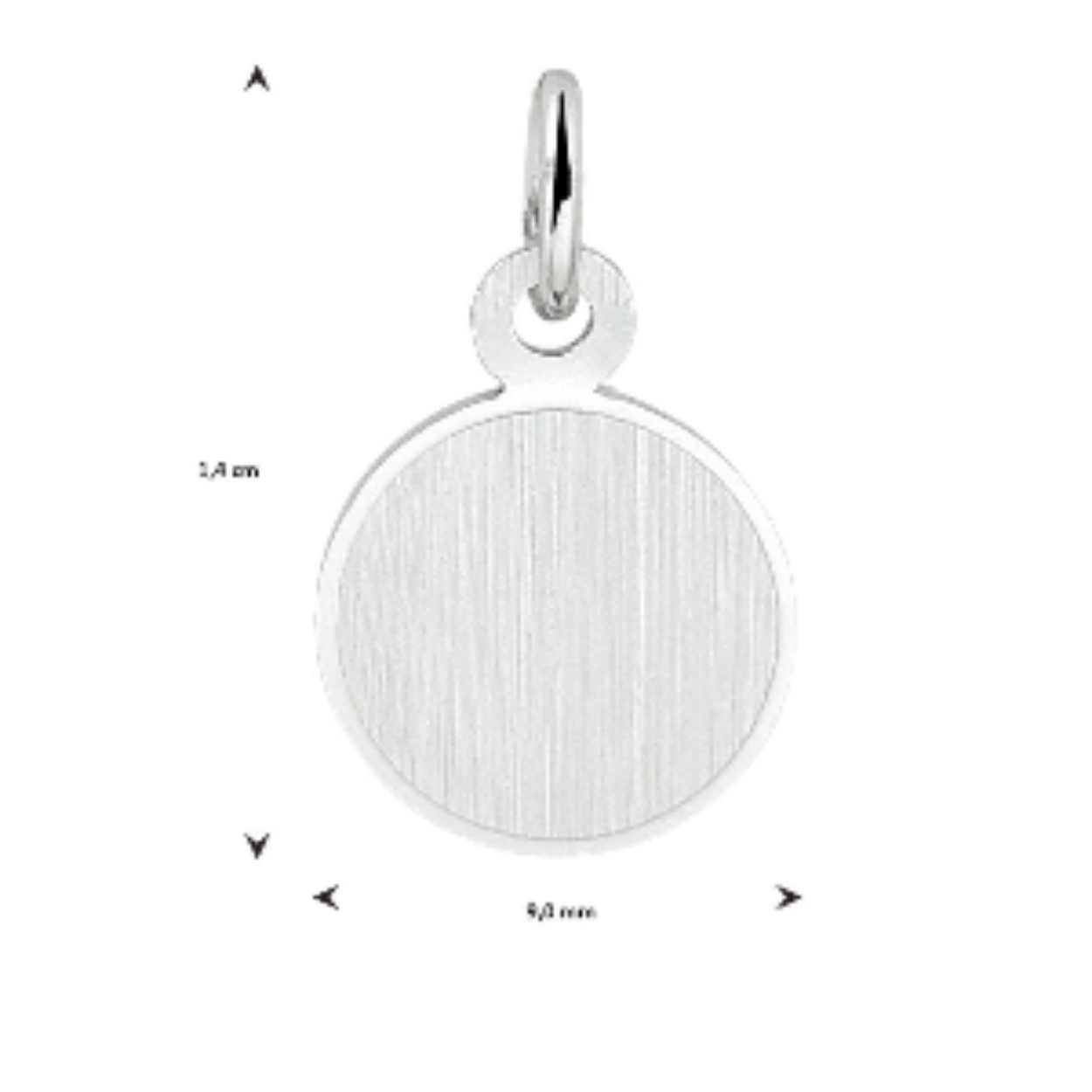Gerhodineerd 925 zilveren ronde graveerhanger met een mat/gediamanteerde afwerking. De hanger heeft een totale hoogte van 1.4cm, een diameter van 9mm en een dikte van 0.6mm