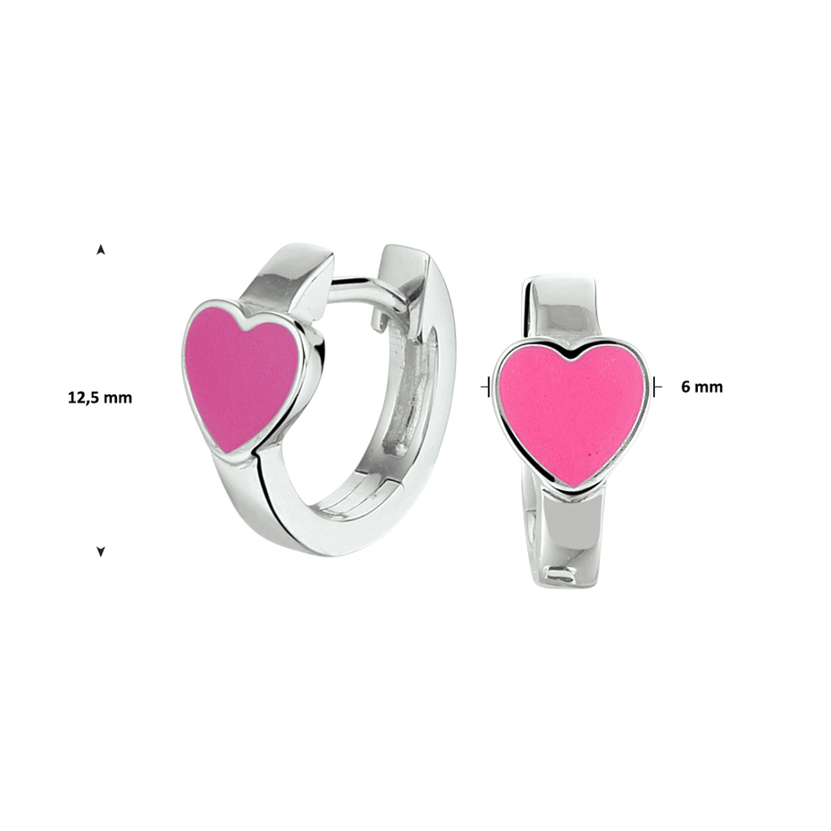 Schattige gerhodineerd zilveren oorringen met scharnier uitgevoerd met een hart in donkerroze emaille. De oorringen hebben een diameter van 12.5mm.