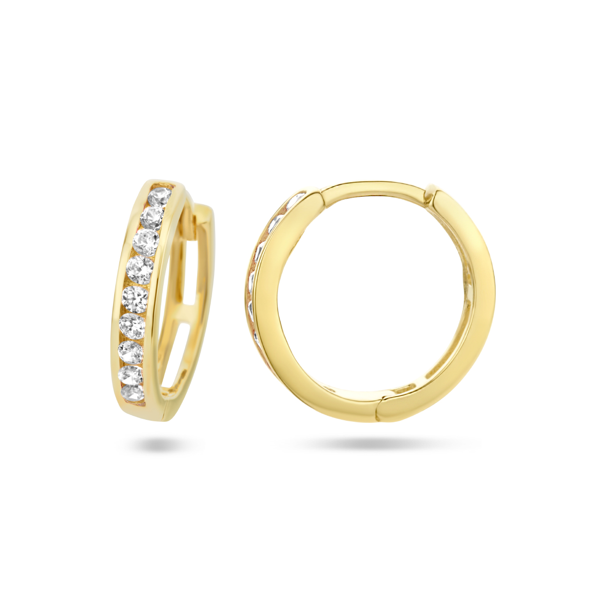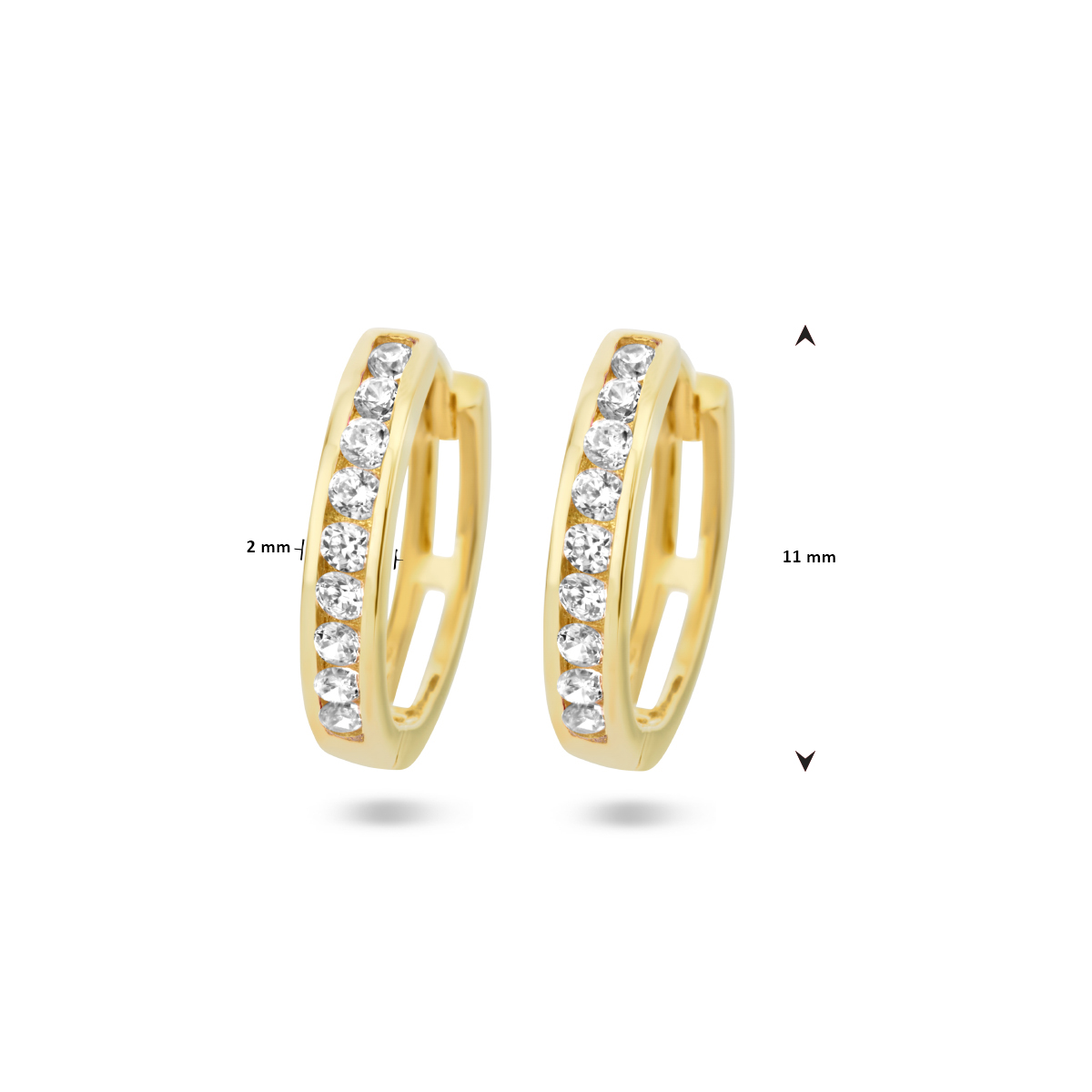 14k Geelgouden klapoorringen uitgevoerd met wit zirkonia. De klapoorringen hebben een afmeting 11x2mm.