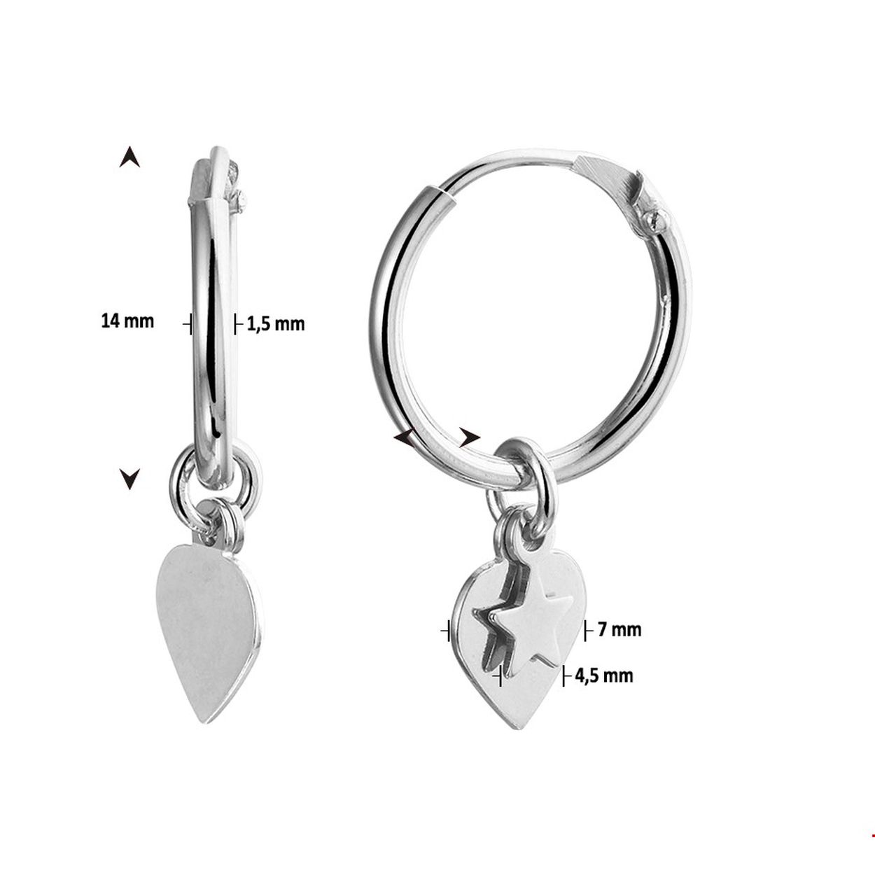 Beschrijving: Gerhodineerd zilveren oorringen met een hart en ster hanger. De oorringen hebben een afmeting van 14x1.5mm. Tip: Leuk om kado te geven! Info: Gerhodineerd zilver is door de rhodiumlaag beter bestand tegen verkleuren en krassen.