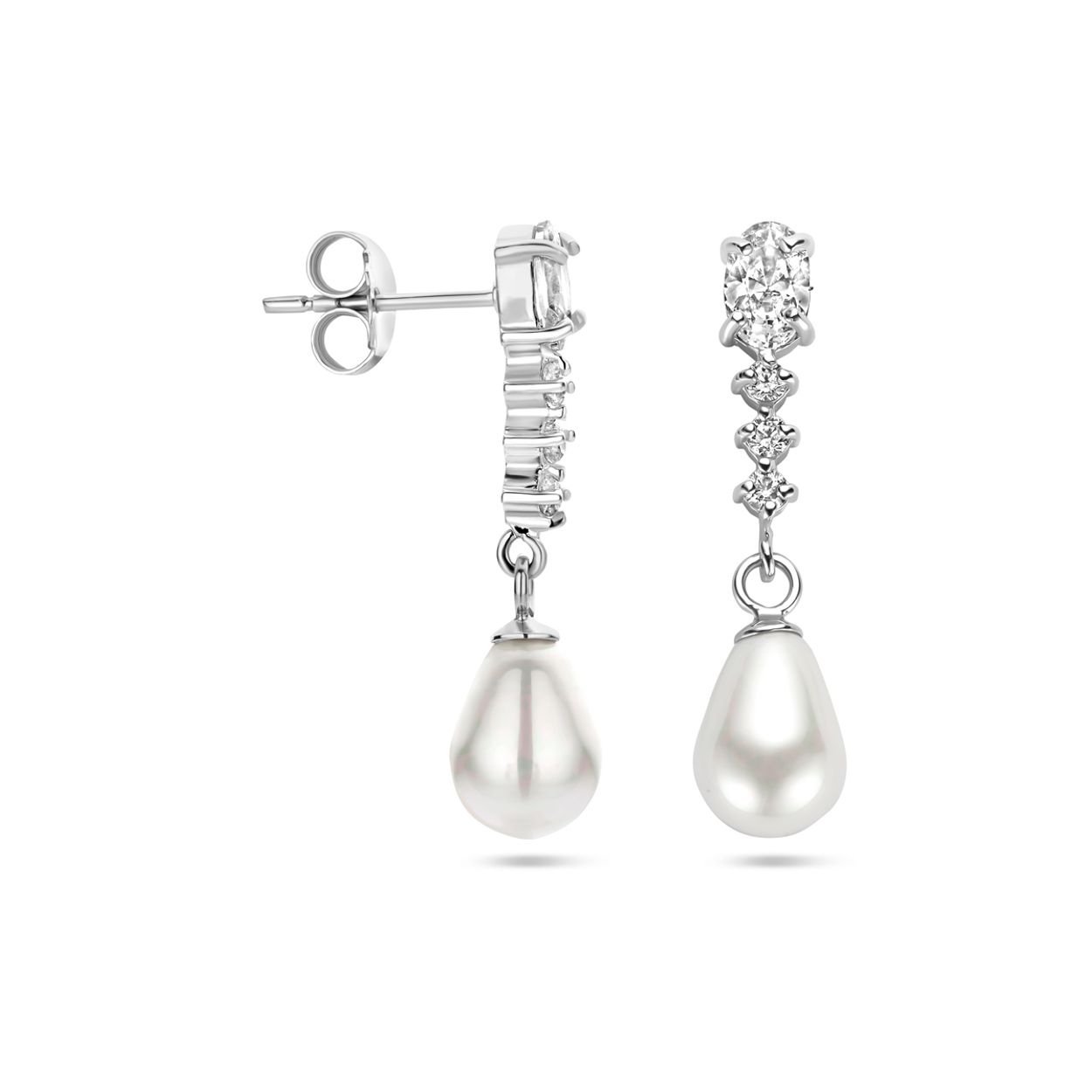 Gerhodineerd 925 zilveren oorhangers uitgevoerd met zirkonia en imitatieparel. De oorhangers hebben een totale hoogte van 25mm.