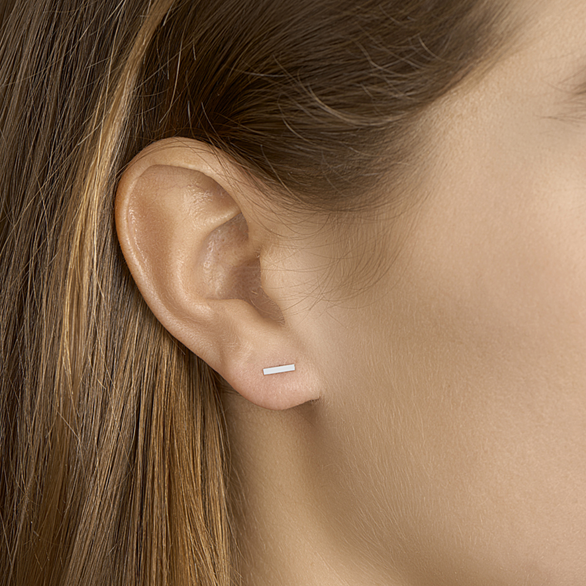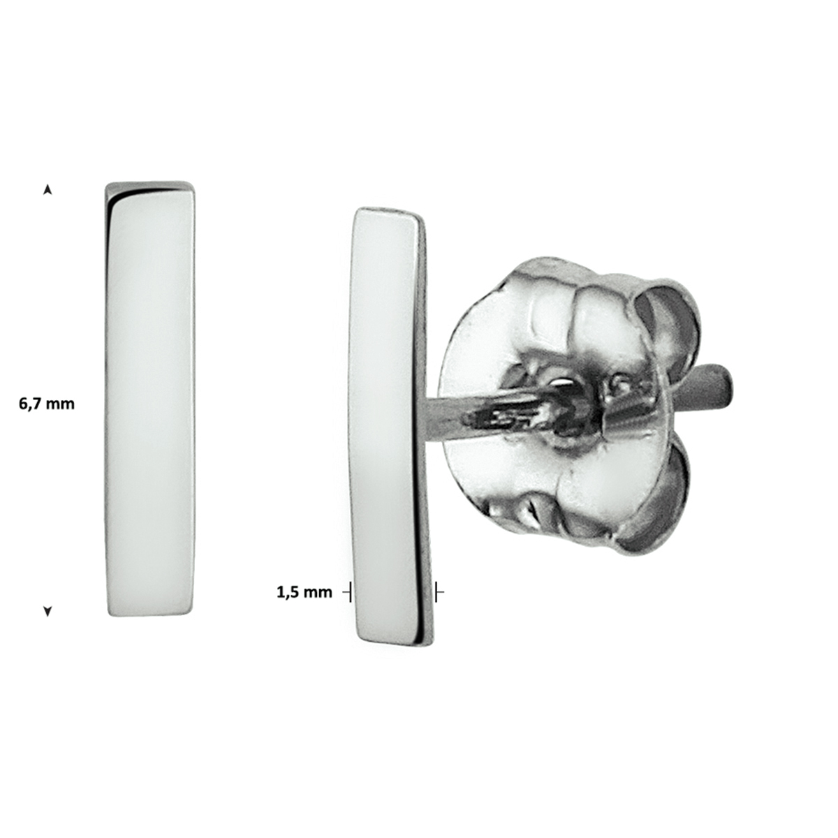 14k Witgouden oorknoppen in de vorm van een balkje. De oorknoppen hebben een afmeting van 6.7x1.5mm.
