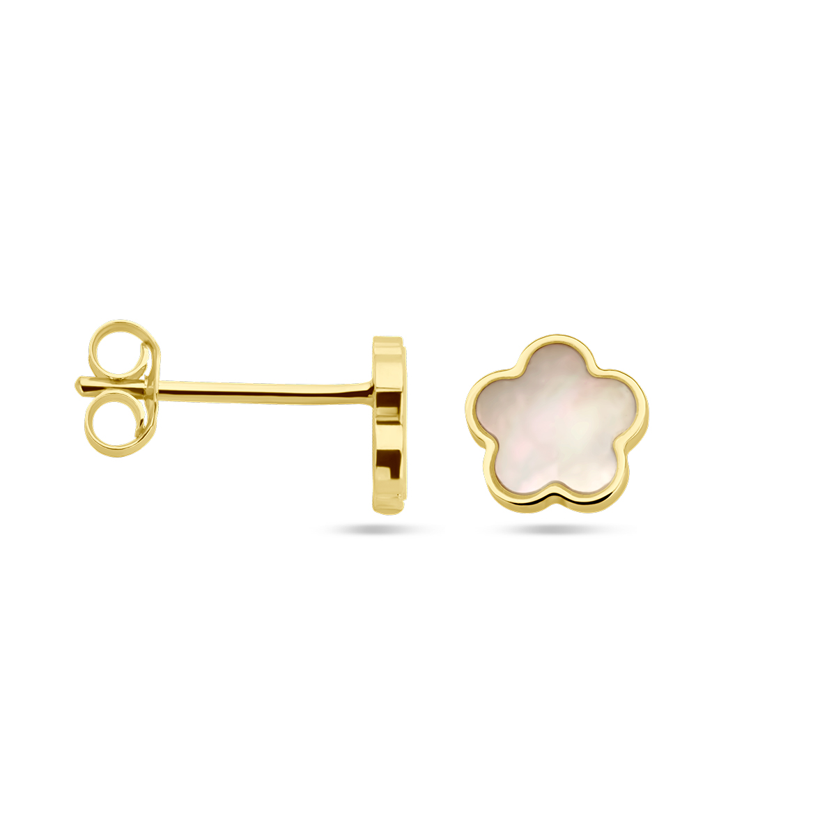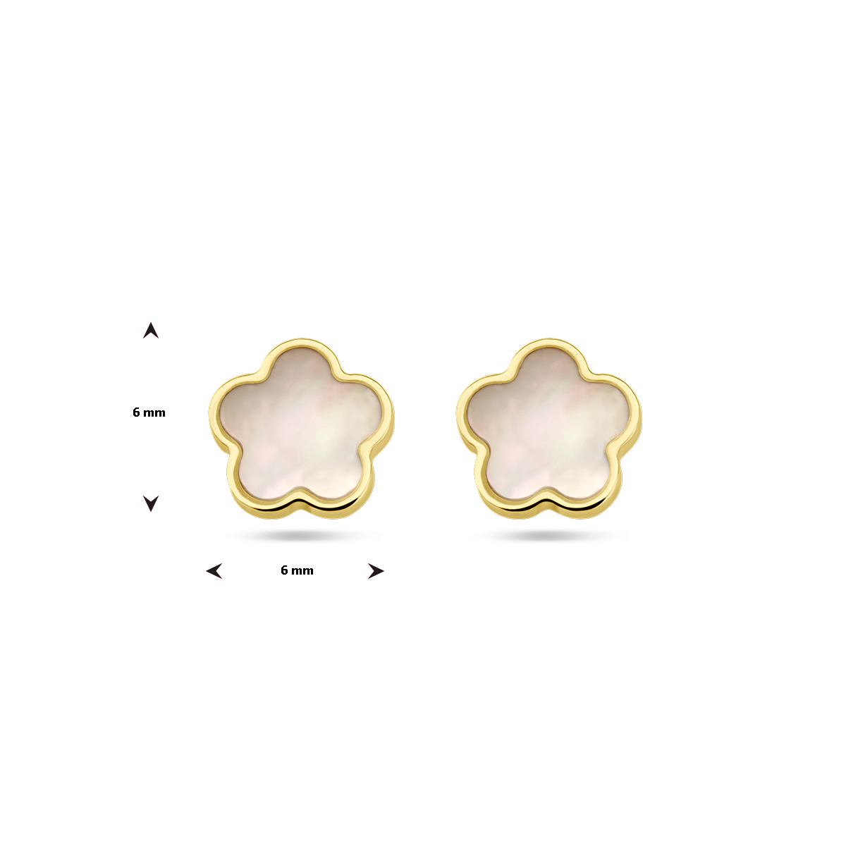 14k Geelgouden oorknoppen uitgevoerd in de vorm van een bloem met parelmoer. De oorknoppen hebben een afmeting van 6.0x6.0mm.