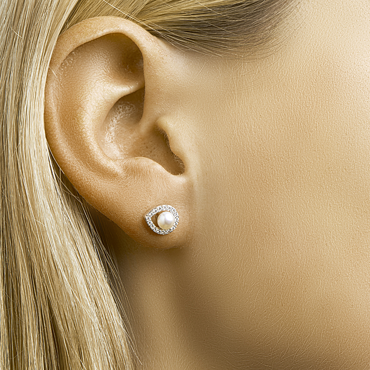 Gerhodineerd zilveren oorknoppen met zirkonia en zoetwaterparel. De oorknoppen zijn onderdeel van een set.