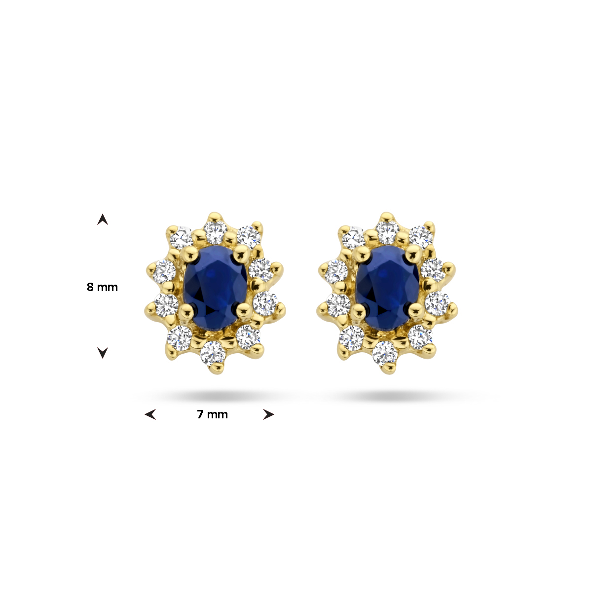 Geelgouden oorknoppen met saffier en zirkonia. De oorknoppen zijn onderdeel van een set.