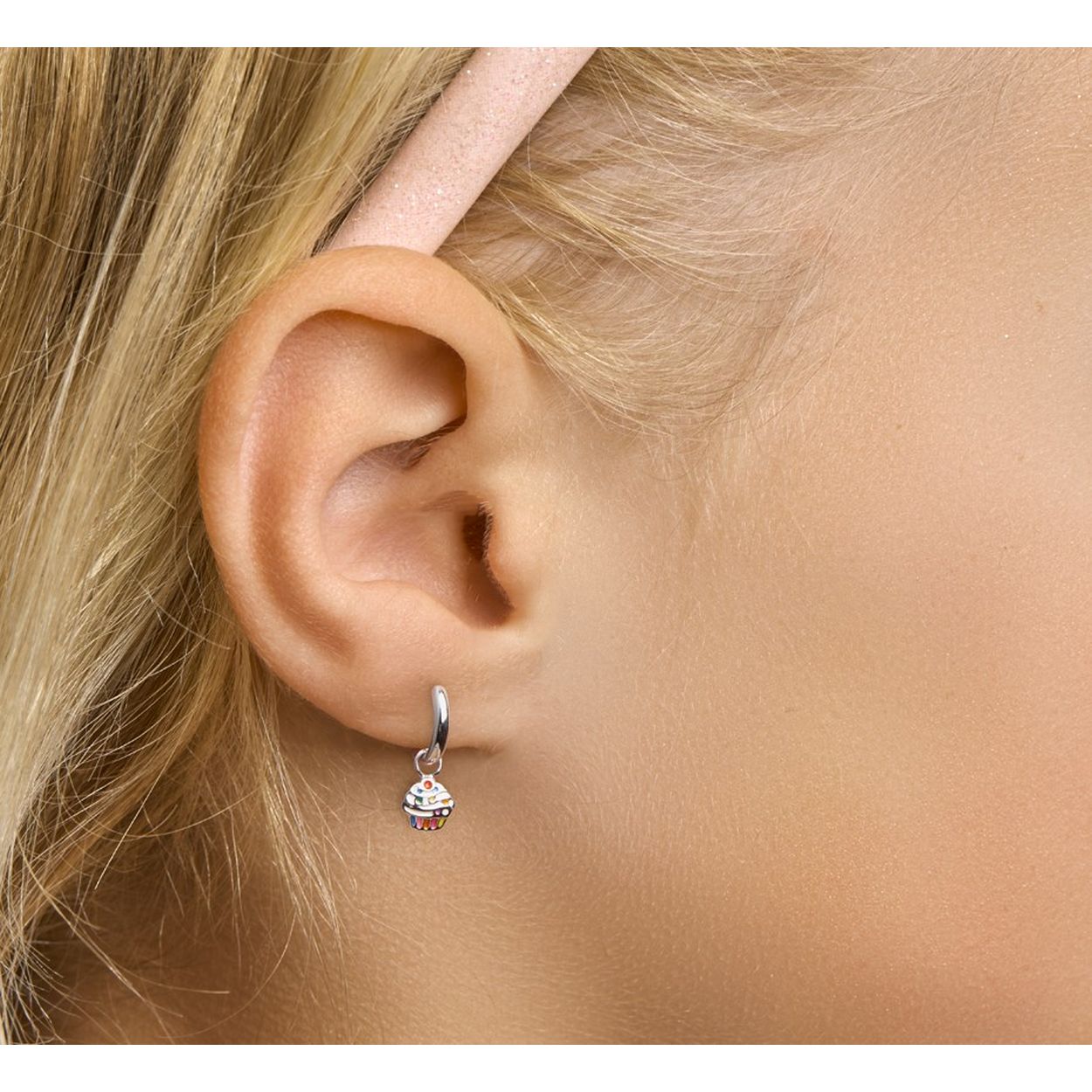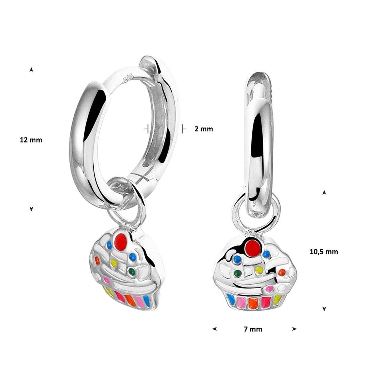 Schattige gerhodineerd zilveren oorringen uitgevoerd met een cupcake hanger in verschillende kleuren emaille. De oorringen hebben een diameter van 12mm.