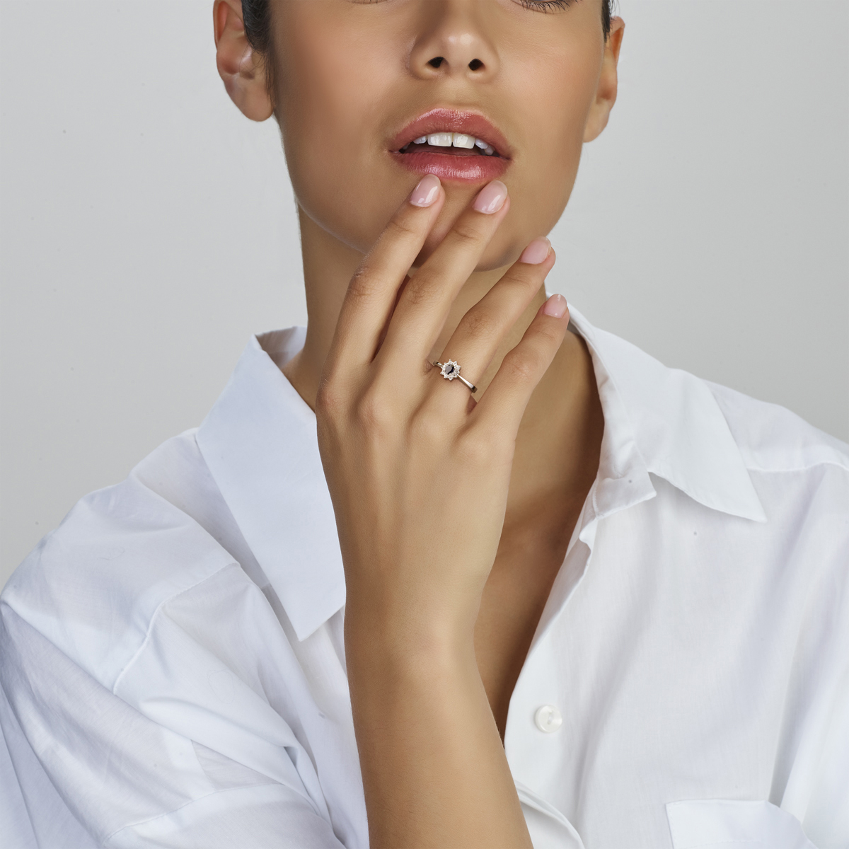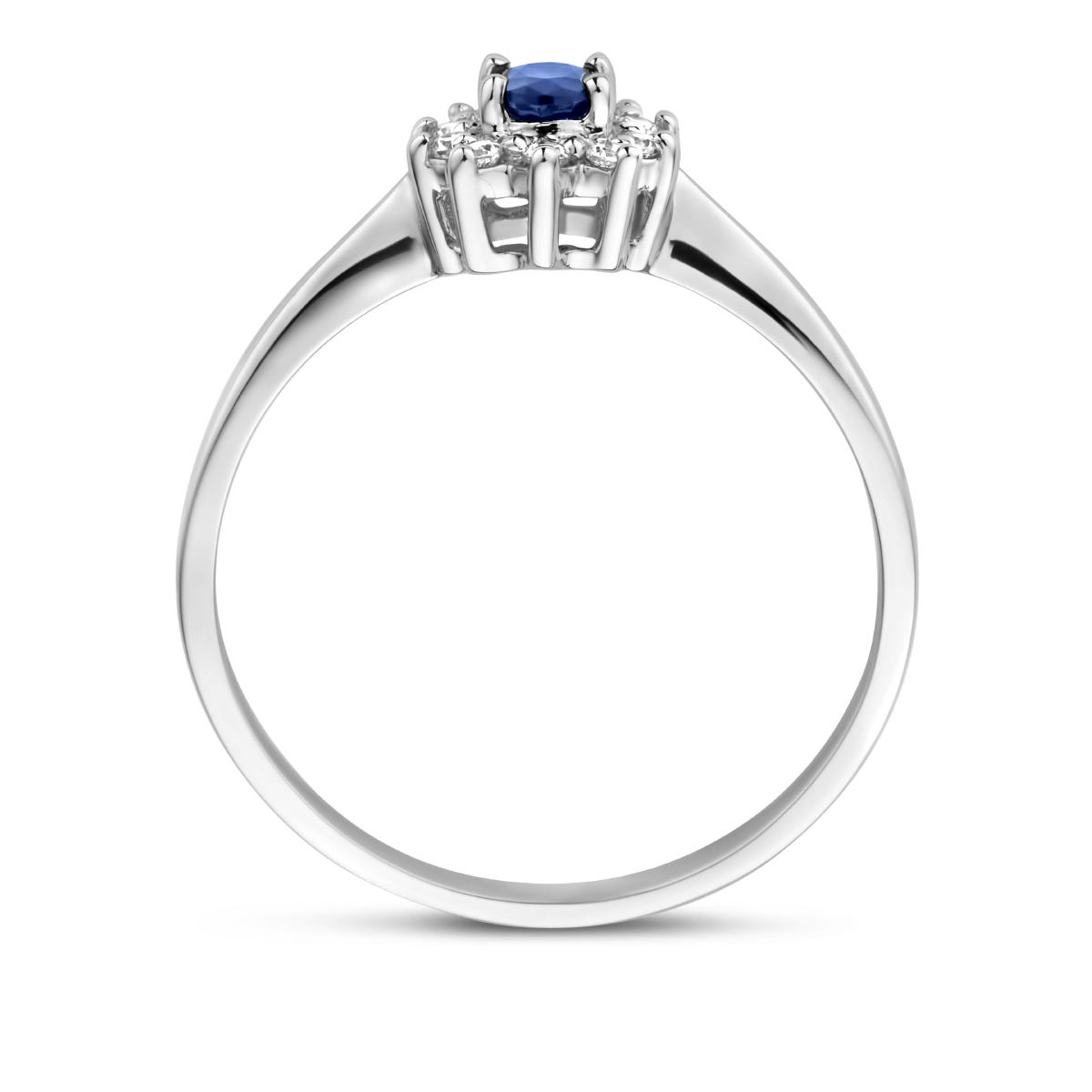 Witgouden ring met saffier en zirkonia.