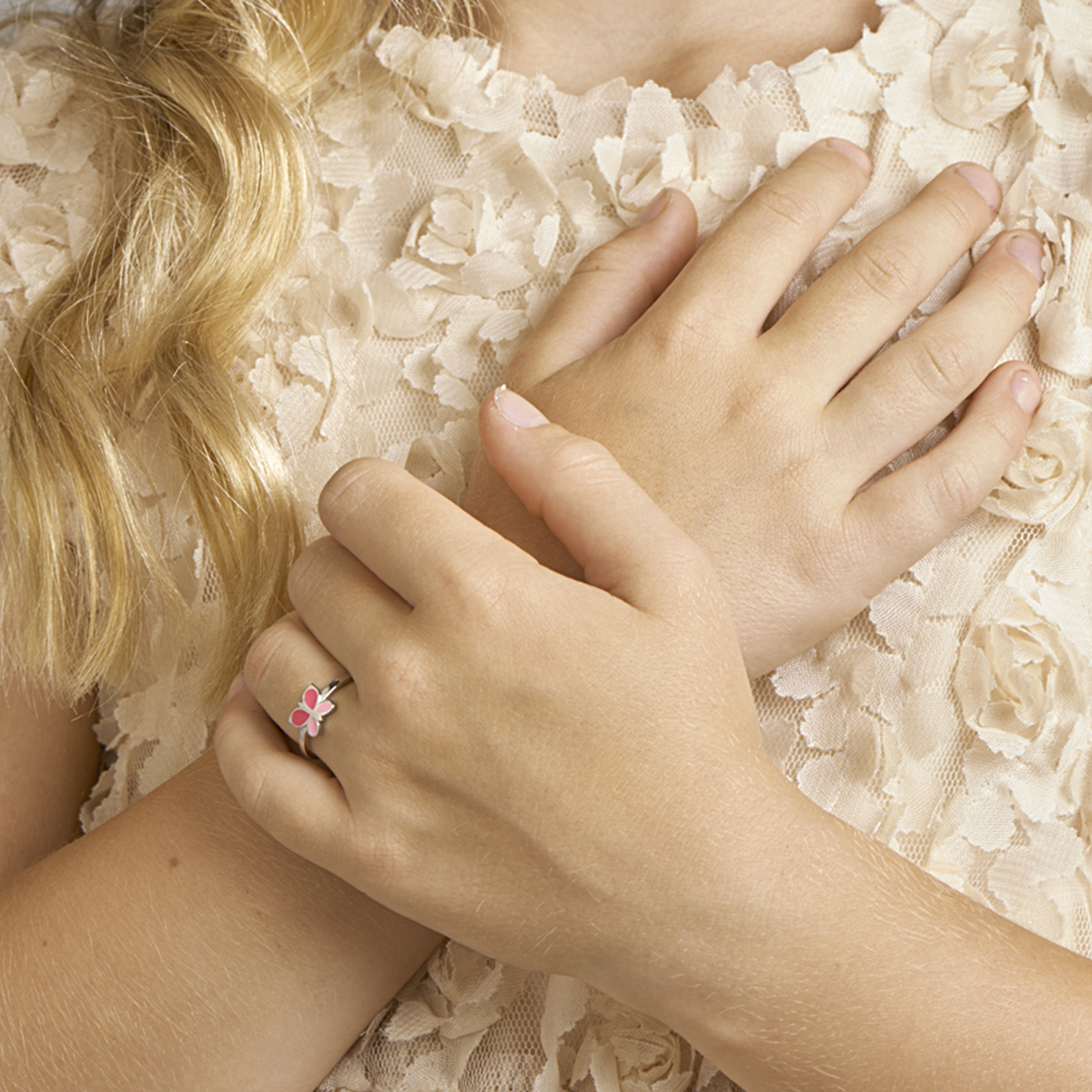 Gerhodineerd zilveren vlinder ring uitgevoerd met rood en roze emaille. De ring is er in verschillende maten en heeft een breedte van 9mm. U kunt deze ring combineren met bijpassende sieraden uit onze collectie.