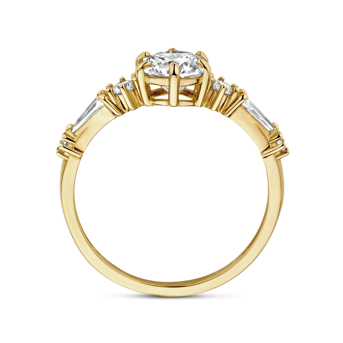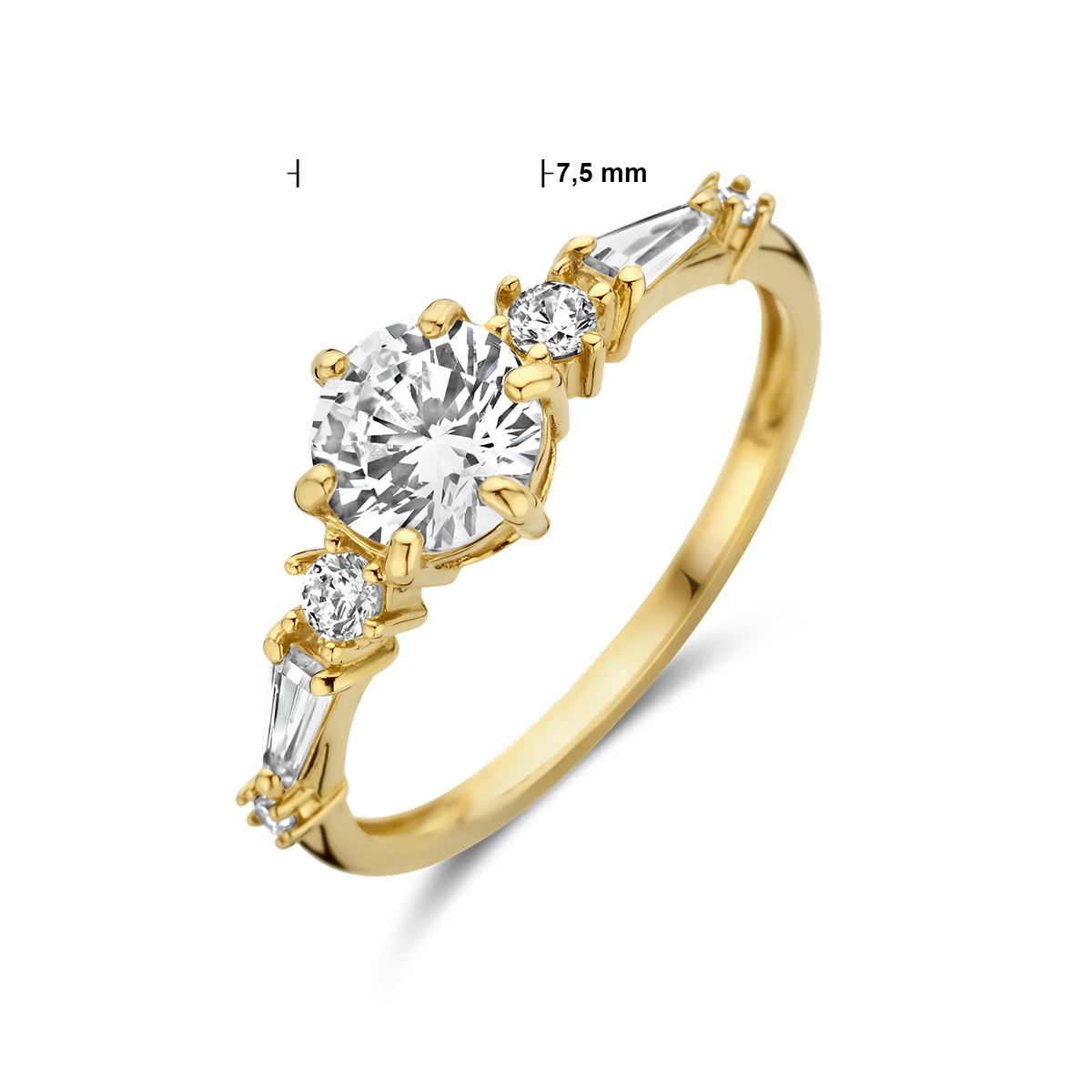14k Geelgouden ring uitgevoerd met zirkonia. De ring heeft een breedte van 7.5mm.