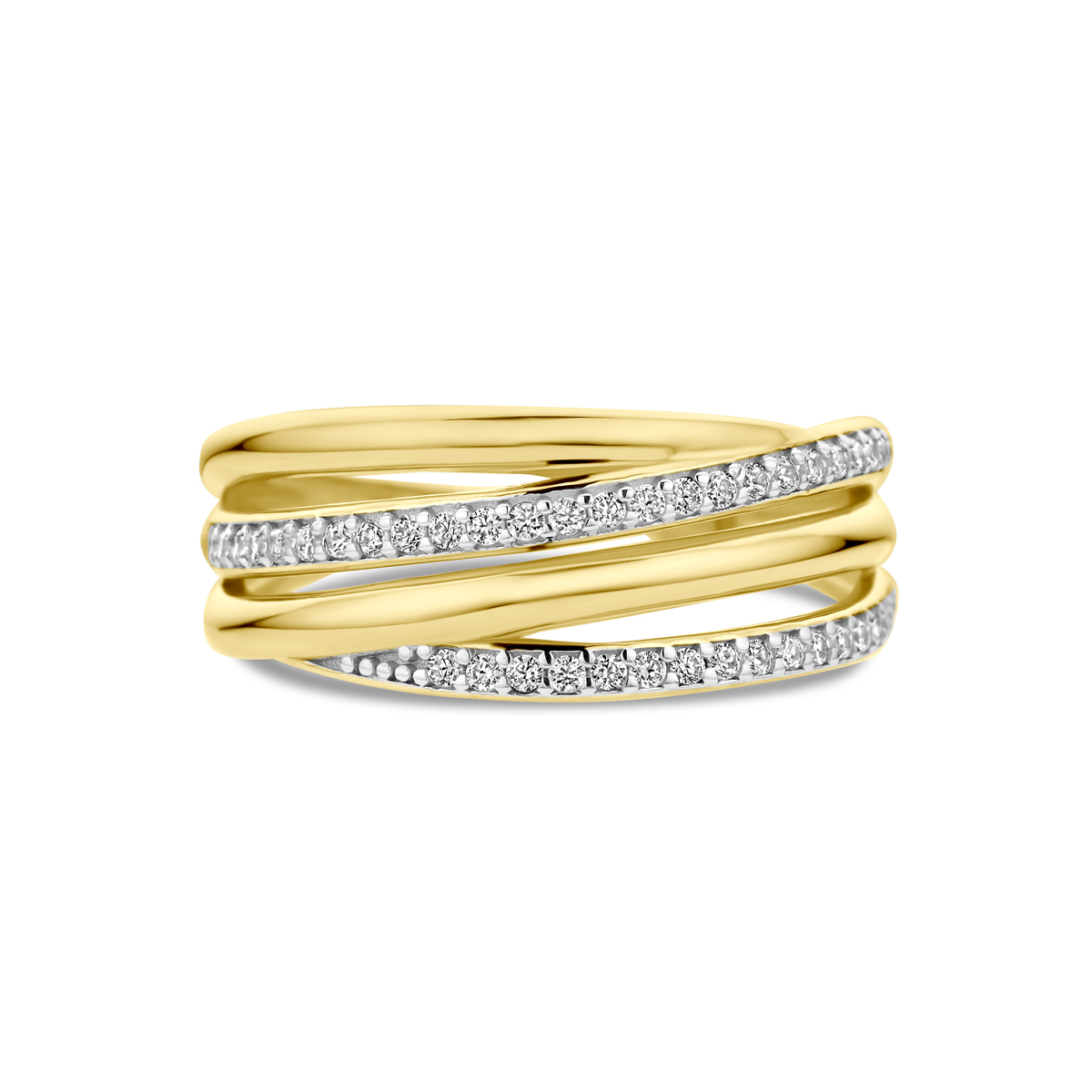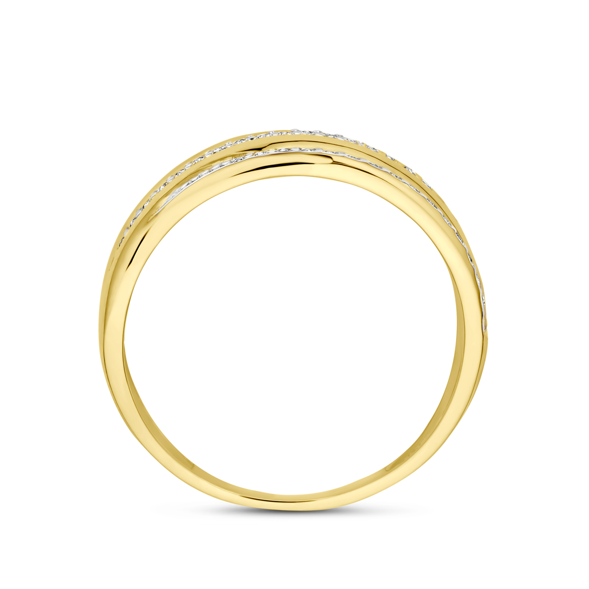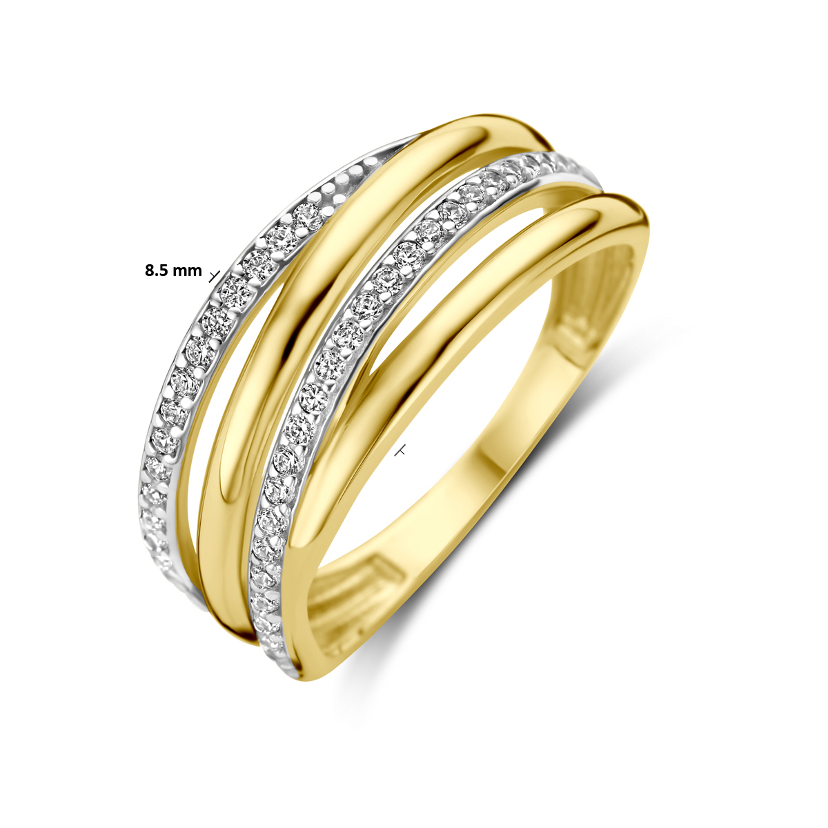 14k Geelgouden ring uitgevoerd met zirkonia. De ring heeft een breedte van 8.5mm.