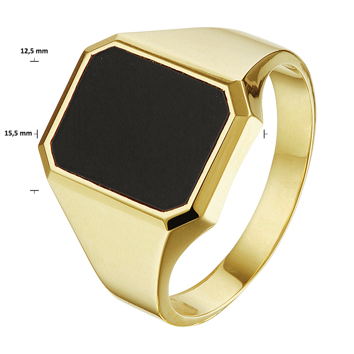 Stijlvolle geelgouden zegelring uitgevoerd met een onyx steen. De robuuste afkanteningen van de ring maken dit sieraad helemaal af. De ring geeft je look direct een chique uitstraling.