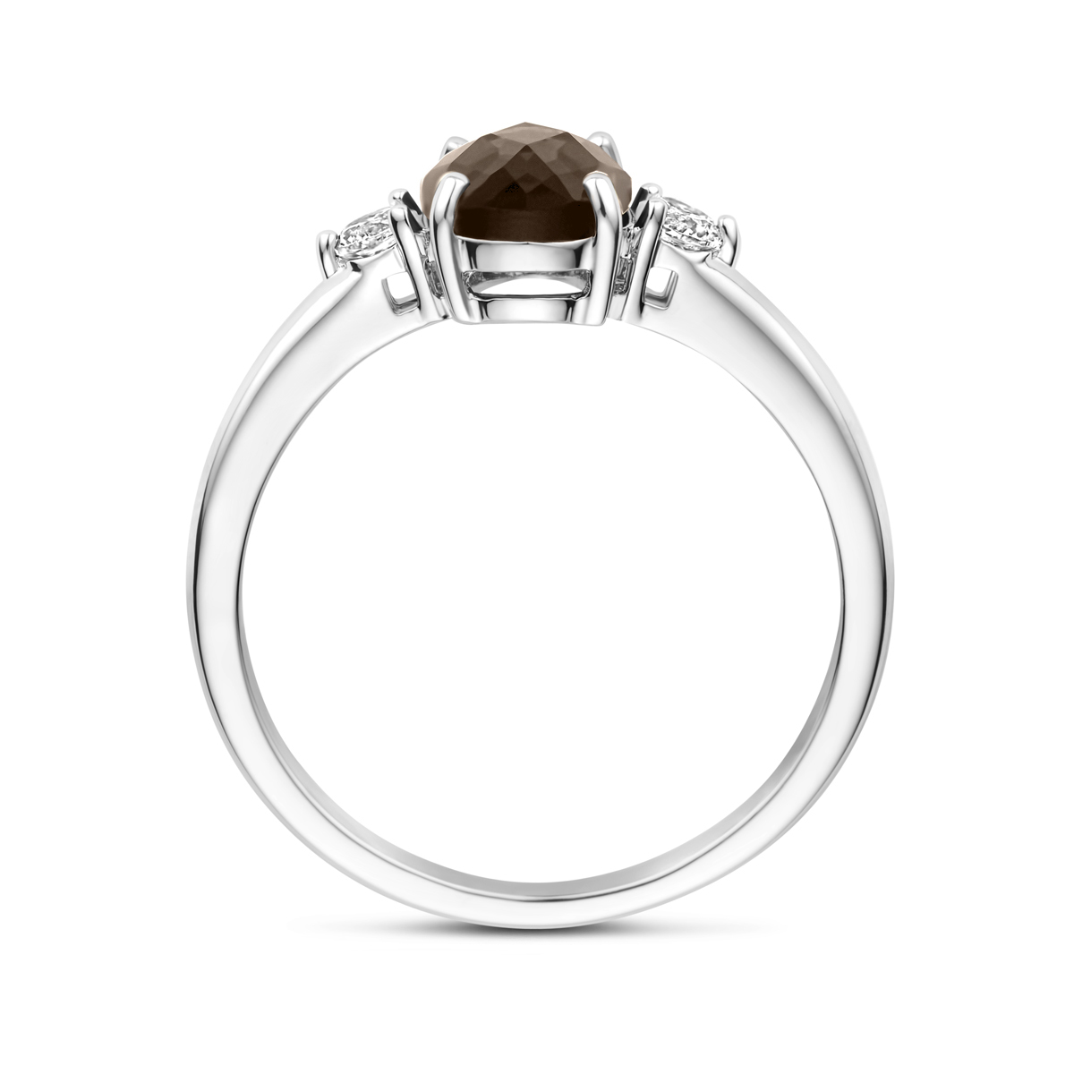 Gerhodineerd 925 zilveren ring uitgevoerd met rookkwarts en zirkonia. De ring heeft een breedte van 8mm. De rookkwarts heeft een afmeting van 8x6mm en de zirkonia van 2.5mm.