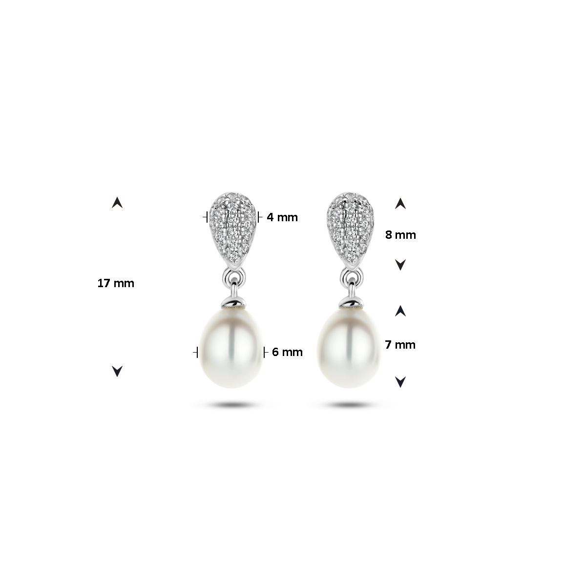 Gerhodineerd 925 zilveren oorhangers uitgevoerd met zoetwaterparel en zirkonia. De oorhangers hebben een totale hoogte van 17mm.